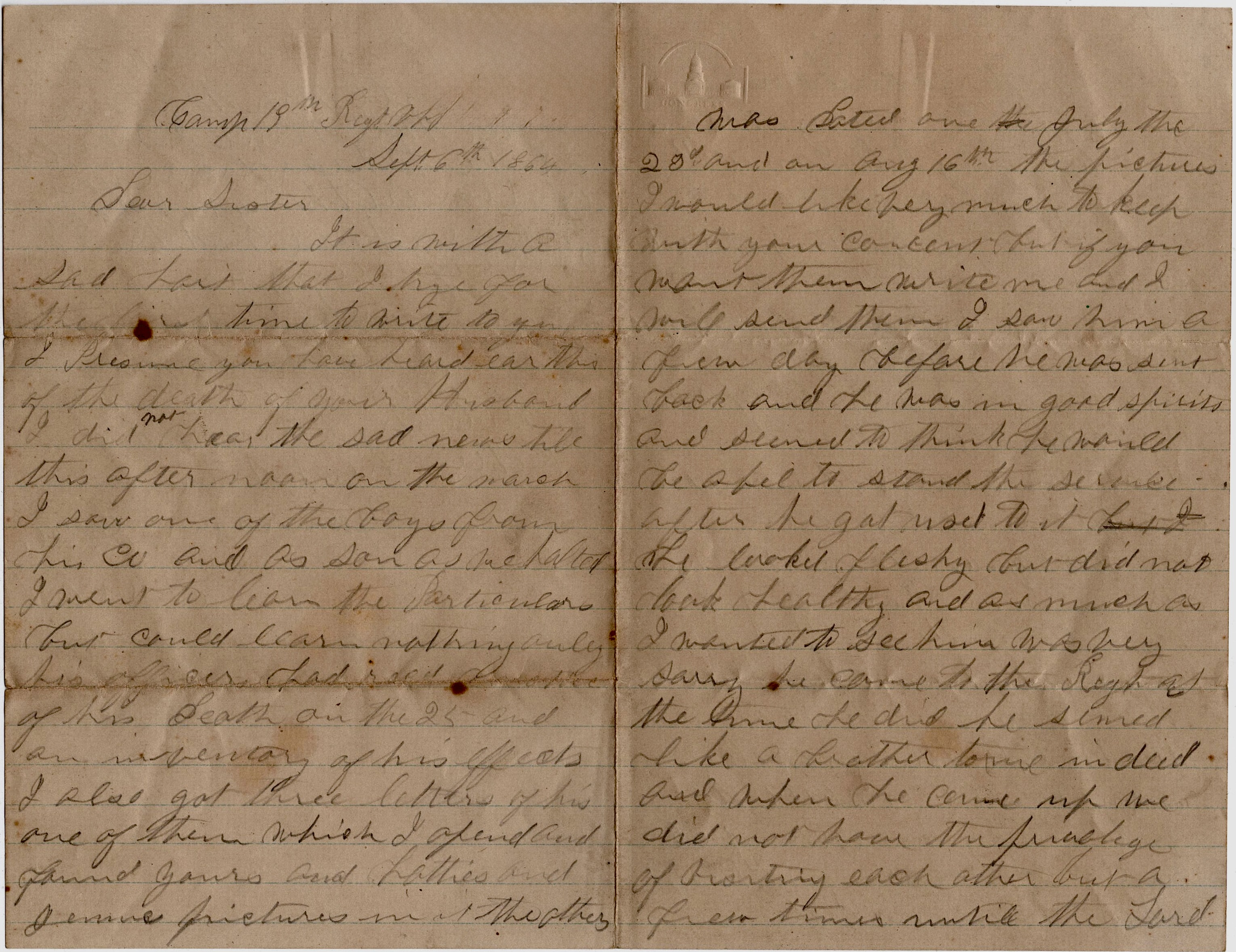 It is with a sad heart that I try for the first time to write to you. I presume you have heard ere this of the death of your husband. I did not hear the sad news till this afternoon on the march. I saw one of the boys from his company [Co. C, 125th OVI] and as soon as we halted, I went to learn the particulars but could learn nothing—only his officers had received a notice of his death on the 25th and an inventory of his effects. I also got three letters of his, one of them which I opened and found yours and Hattie’s and Jennie’s pictures in. The others was dated on July 20th and August 16th. The pictures I would like very much to keep with your consent but if you want sent, write me and I will send them.