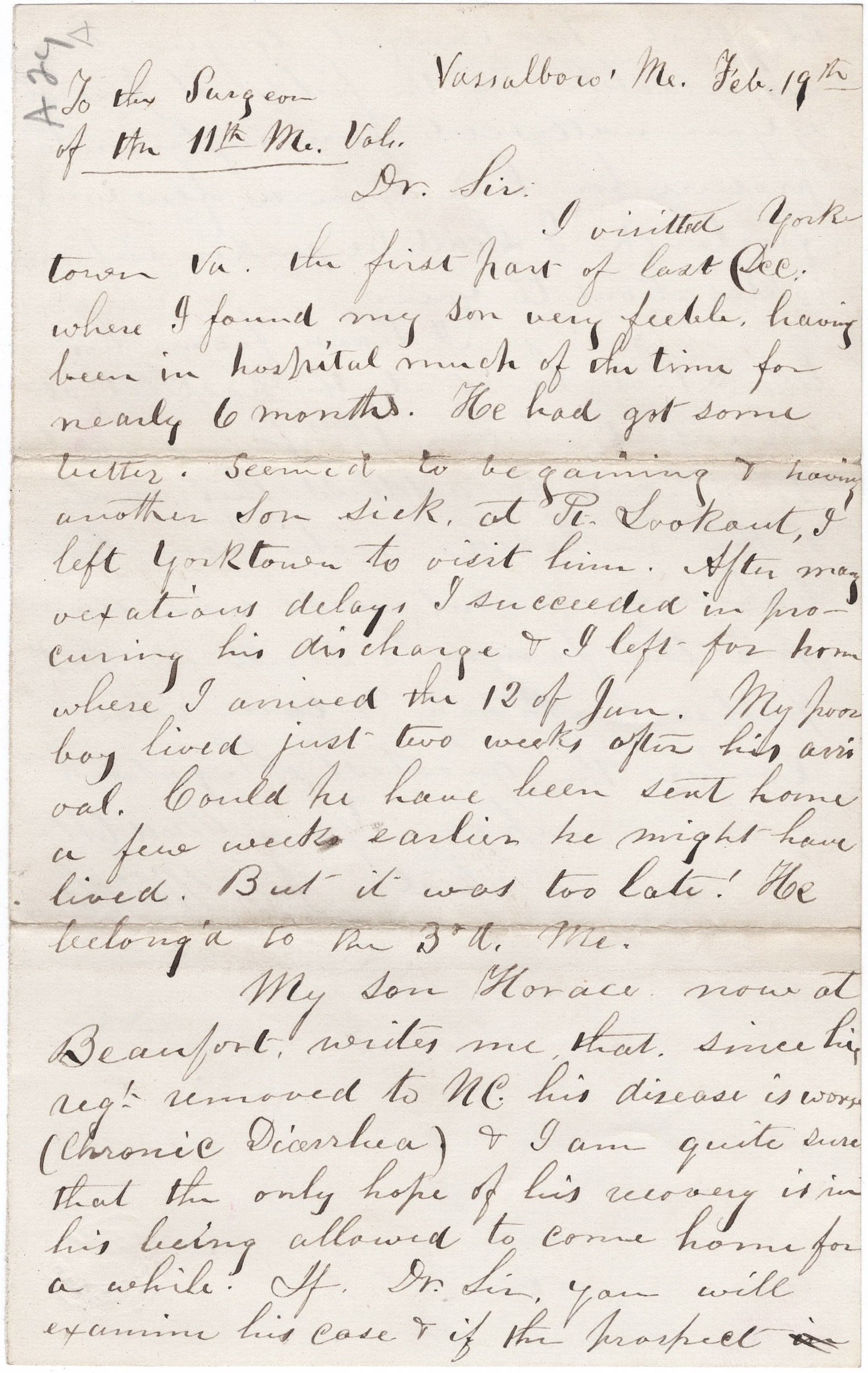 Dear sir, I visited Yorktown, Virginia, the first part of last December where I found my son very feeble, having been in hospital much of the time for nearly 6 months. He had got some better. Seemed to be gaining & having another son sick at Point Lookout, I left Yorktown to visit him. After many vexatious delays, I succeeded in procuring his discharge & left for home where I arrived the 12th of January. My poor boy lived just two weeks after his arrival. Could he have been sent home a few weeks earlier, he might have lived. But it was too late. He belonged to the 3rd Maine. 1