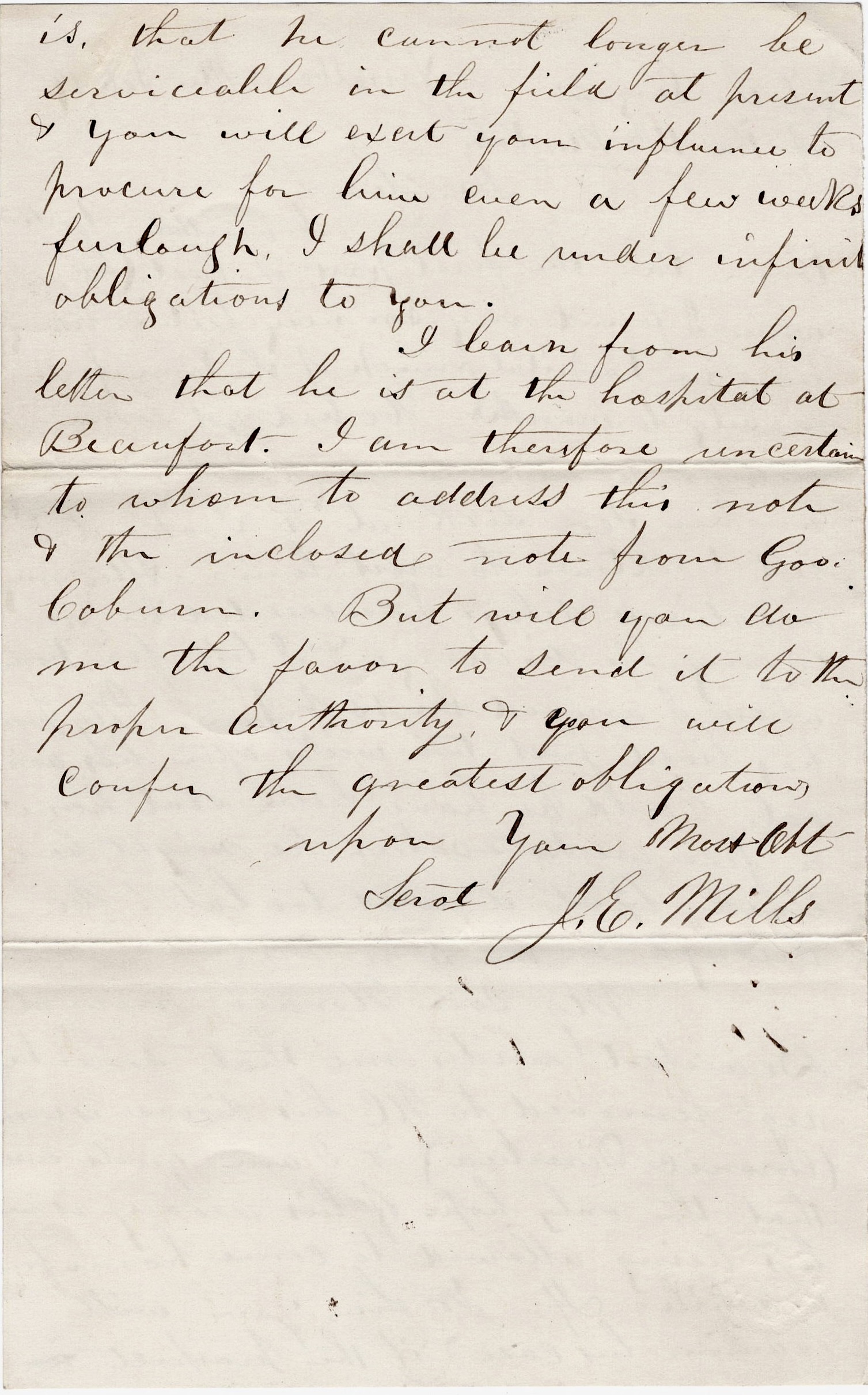 I learn from his letter that he is at the hospital at Beaufort. I am therefore uncertain to whom to address this note & the enclosed not from Gov. Coburn. But will you do me the favor to send it back to the proper authority & you will confer the greatest obligation upon your most obedient servant, — J. E. Mills