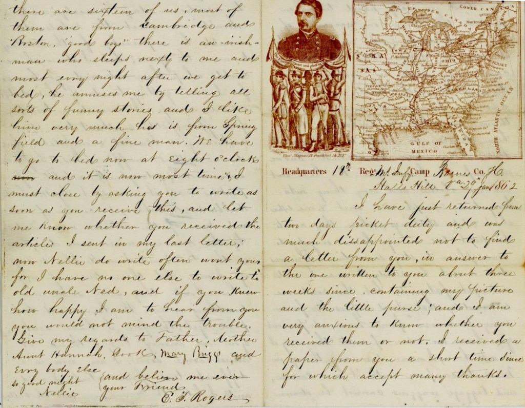 We have not been paid yet, therefore, I have sent you no money; but I think it must come soon. I am now in a different tent from what I was, and I like the company much better. There are sixteen of us. Most of them are from Cambridge and Boston—“good boys.” There is an Irishman who sleeps next to me and most every night after we get to bed, he amuses me by telling all sorts of funny stories and I like him very much. He is from Springfield and a fine man. We have to go to bed now at eight o’clock and it is now most time & I must close by asking you to write as soon as you receive this and let me know whether you received the articles I sent in my last letter. Now Nellie, do write often won’t you, for I have no one else to write to old uncle Ned, and if you knew how happy I am to hear from you, you would not mind the trouble. Give my regards to Father, Mother, Aunt Hannah, Cook, Mary Briggs, and everybody else. So goodnight and believe me ever your Friend, — E. T. Rogers