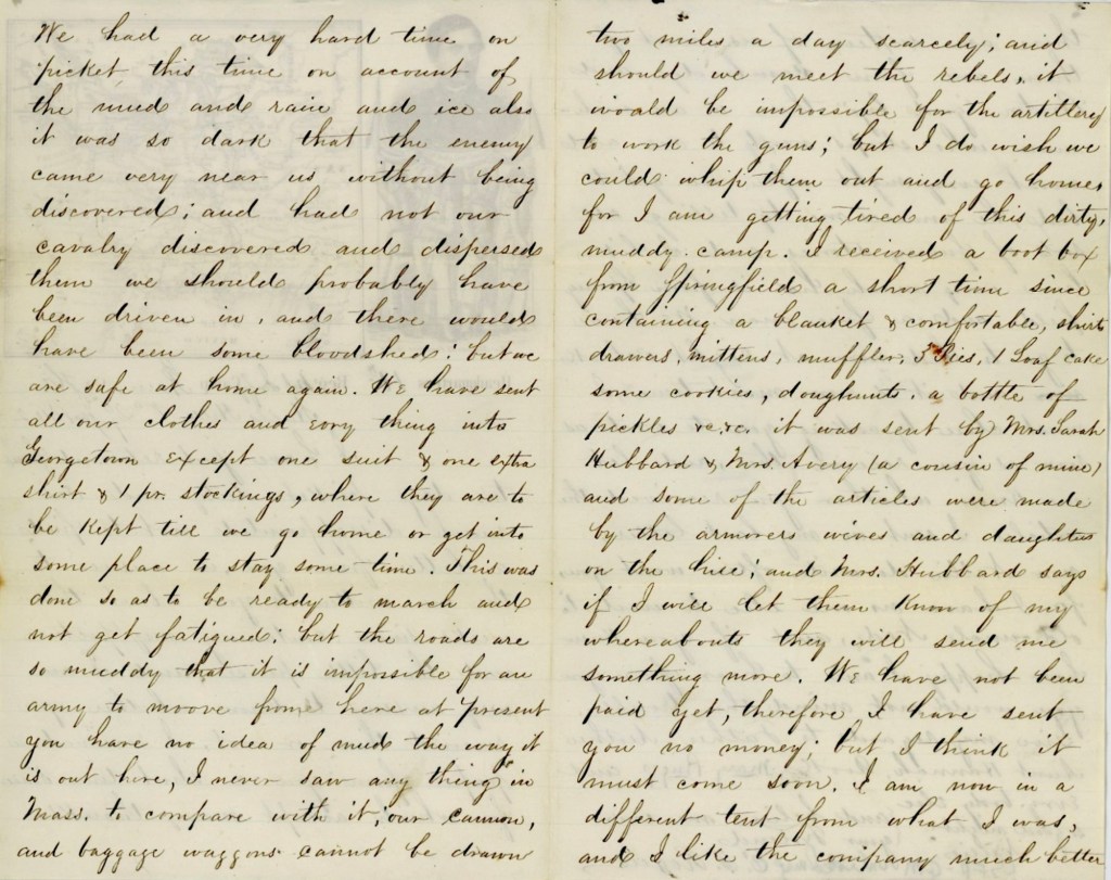 I received a boot box from Springfield a short time since containing a blanket & comfortable shirts, drawers, mittens, muffler, 3 pies, 1 loaf cake, some cookies, doughnuts, a bottle of pickles, &c., &c. It was sent by Mrs. Sarah Hubbard & Mrs. Avery (a cousin of mine) and some of the articles were made by the armorer’s wives and daughters on the hill. And Mrs. Hubbard says if I will let them know of my whereabouts, they will send me something more.