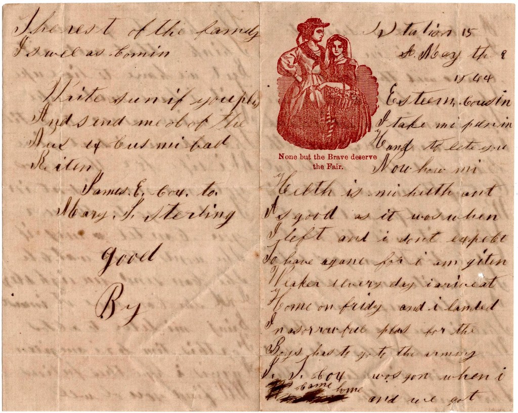 I take my pen in hand to let you know how my health is. My health ain’t as good as it was when I left and I don’t expect to have [it] again for I am getting weaker every day. I arrived at home on Friday and I landed in a sorrowful place for the Boys has to go to the army. J. T. Cox was gone when I came home and we got a letter from him today and he is in Camp Chase and the rest of the Boys has to leave in the morning. 1