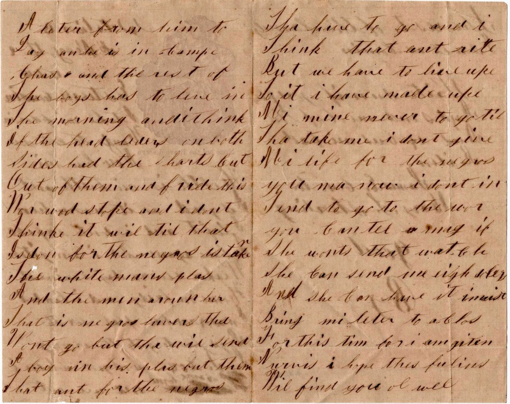 I think if the head leaders on both sides had the hearts cut out of them and fried, this war would stop. And I don’t think it will till that is done for the negroes is taken the white man’s place. And the men around here that is negro lovers, they won’t go, but they will send a boy in his place. But them that ain’t for the negroes, they have to go, and I think that ain’t right. But we have to live up to it. I have made up my mind never to go till they take me. I don’t give my life for the negroes. You may know I don’t intend to go to the war.