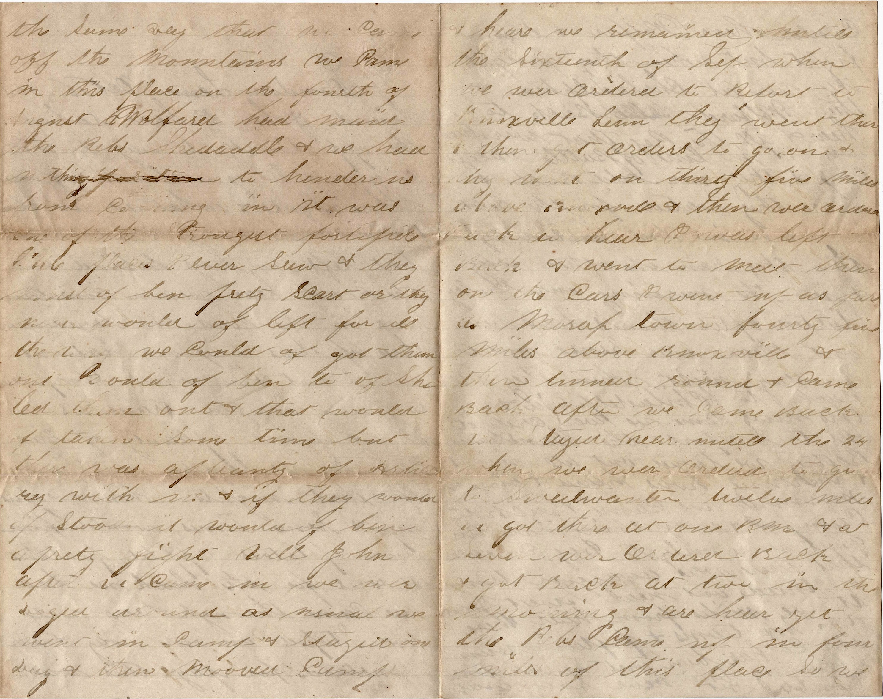 Well, John, after we came in, we were dragged around as usual. We went in camp and stayed one day and then moved camp and here we remained until the 16th of September when we were ordered to report to Knoxville, Tennessee. They went there and then got orders to go on and they went on 35 miles above Knoxville and then were ordered back to here.