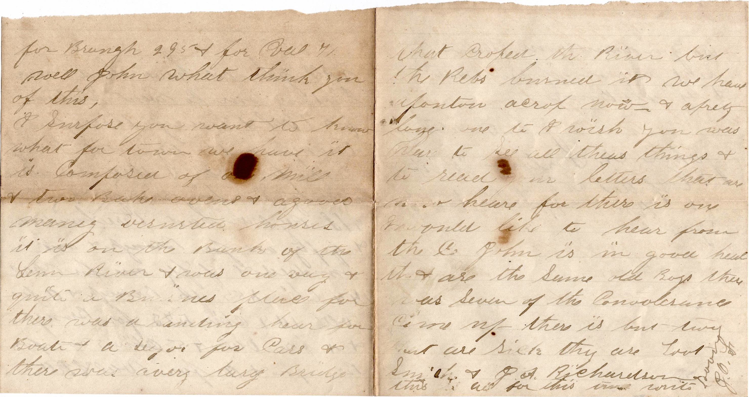 I suppose you want to know what for [a] town we have. It is composed of one mill and two bake ovens and a good many deserted houses. It is on the bank of the Tennessee river and was one day quite a business place for there was a landing here for boats and a depot for cars, and there was a very large bridge that crossed the river but the Rebs burned it. We have a pontoon across now and a pretty long one too. I wish you was here to see all these things and to read your letters that are now here for there is one I would like to hear from. The company, John, is in good health and are the same old boys. There was seven of the convalescents came up. There is but two that are sick. They are Loot Smith and J[ames] A. Richardson. Do you want your letters sent to you? If so, write and let me know. — J. O. Foote