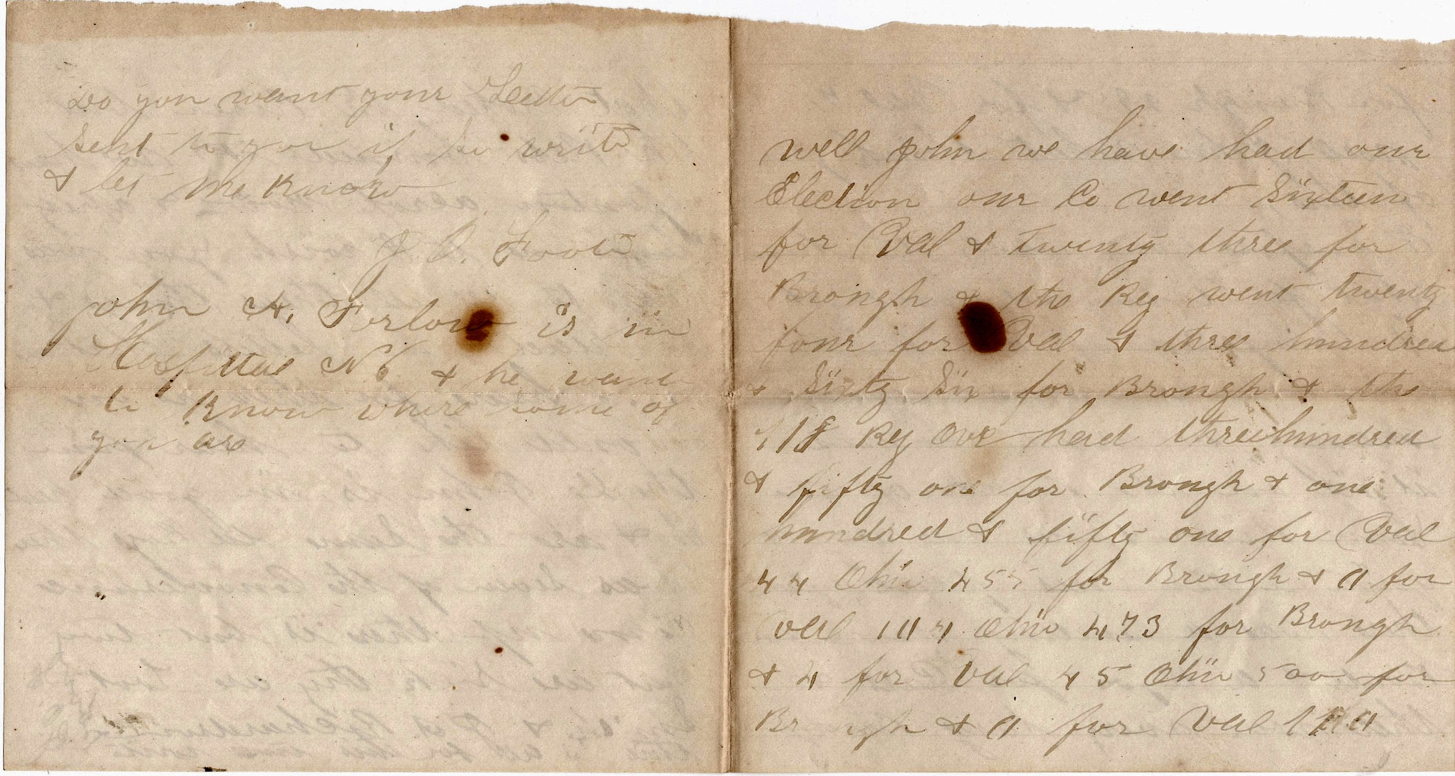 Well John, we have had our election. Our Co. went 16 for Vallandigham and 23 for Brough and the Reg. went 24 for Val. and 366 for Brough and the 118th Reg. OVI had 351 for Brough and 151 for Val. [The] 44th Ohio 455 for Brough and 11 for Val. [The] 104th Ohio 473 for Brough and 4 for Val. [The] 45th Ohio 500 for Brough and 11 for Val. Well, John, what think you of this?