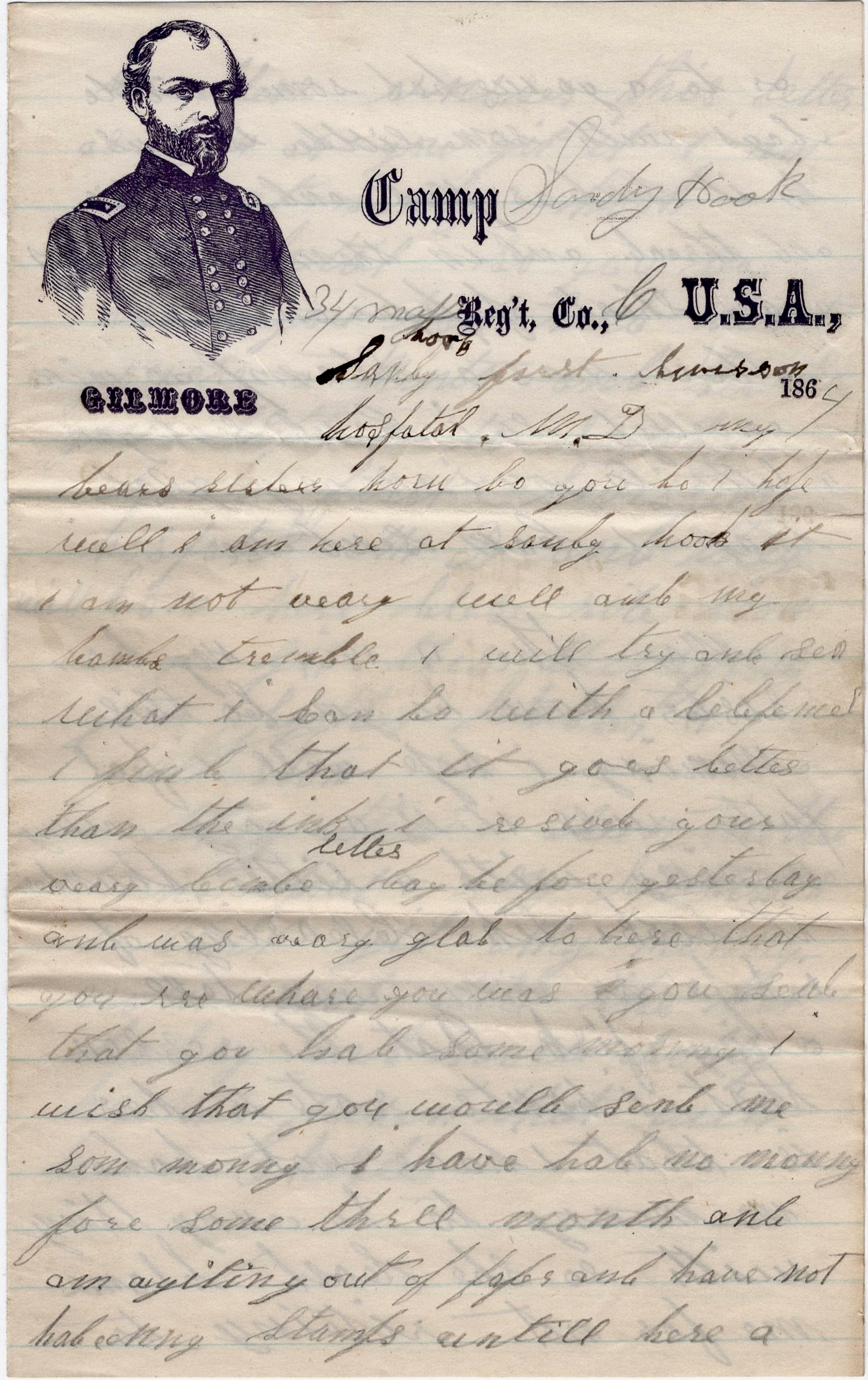 How do you do? I hope well. I am here at Sandy Hook. I am not very well and my hands tremble. I will try and see what I can so with a [pencil?]. I find that it goes better than the ink. I received your very kind letter day before yesterday and was very glad to hear that you are where you was. You said that you wold send me some money. I have had no money for some three months and am getting out of paper and have not had any stamps until here a day or two ago. We had some little bags with some little things in it such as pins and needles and thread and in them an envelope and a sheet of paper. On mine there was a stamp on a nice envelope so I can send a letter to you. I am very glad that I can send one.