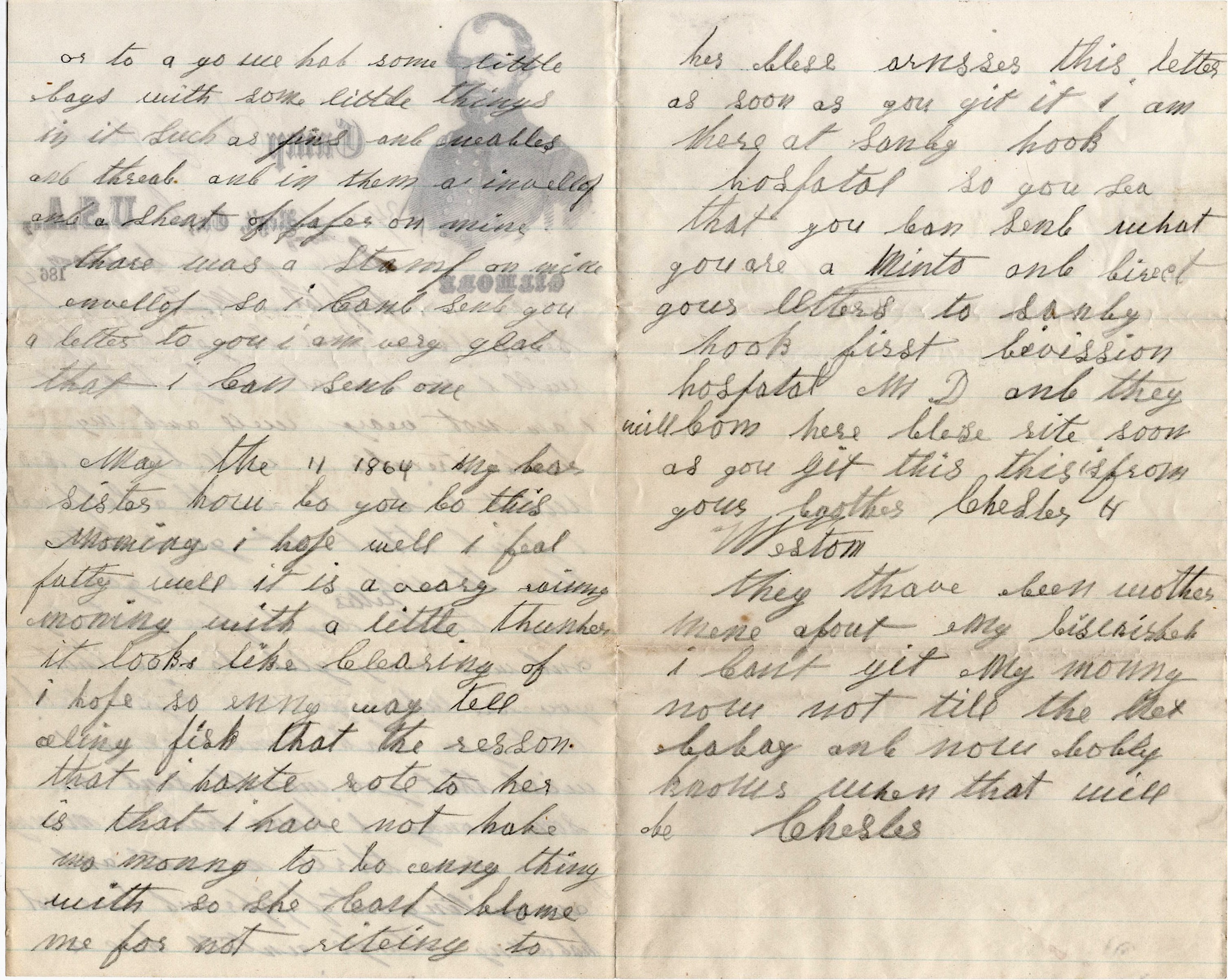 Please answer this letter as soon as you get it. I am here at Sandy Hook Hospital so you see that you can send what you are a mind to and direct your letters to Sandy Hook, First Division Hospital, Maryland, and they will come right here. Please write soon as you get this. This is from your brother Chester H. Weston
