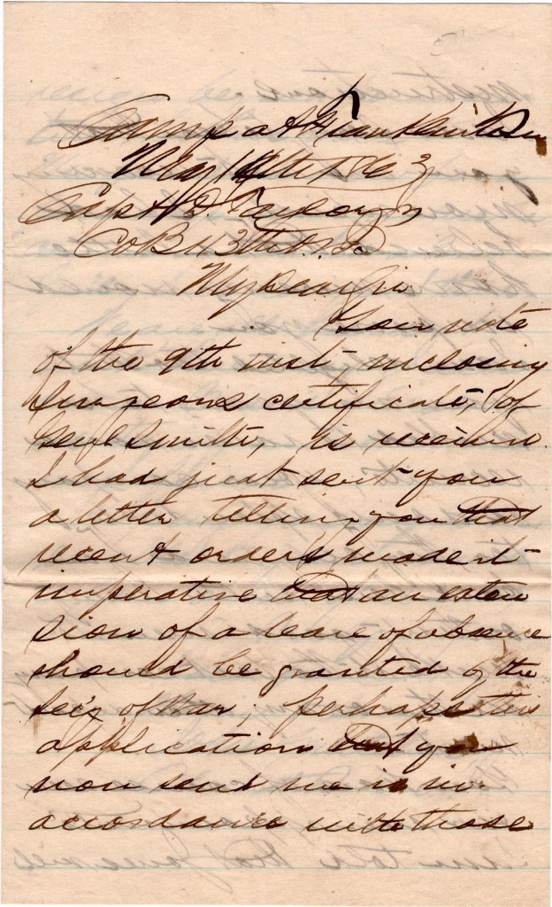 My dear sir, your note of the 9th installment enclosing surgeon’s certificate of General Smith [Surgeon General of Ohio] is received. I had just sent you a letter telling you that recent orders made it imperative that an extension of a leave of absence should be granted to the Secretary of War. Perhaps this application that you now send me is in accordance with those instructions.