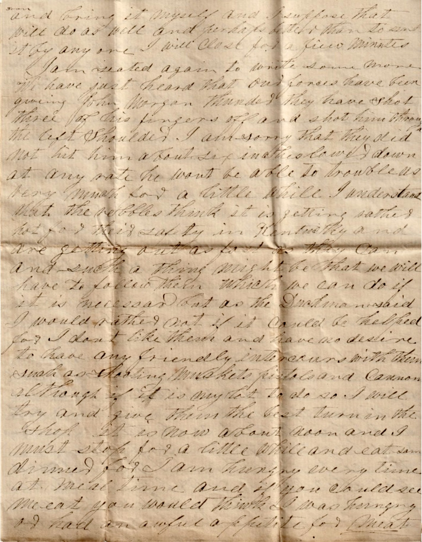 I am seated again to write some more. We have just heard that our forces have been giving John [Hunt] Morgan thunder. They have shot three of his fingers off and shot him through the left shoulder. I am sorry that they did not hit him about six inches lower down. At any rate, he won’t be able to trouble us very much for a litle while. I understand that the rebels think it is getting rather got for their safety in Kentucky and are getting out as fast as they can and such a thing might be that we will have to follow them, which we can do if it is necessary but as the Dutchman said, I would rather not if it could be helped for I don’t like them and have no desire to have any friendly intercourse with them such as shooting muskets, pistols, and cannon, although if it is my lot to do so, I will try and give them the best turn in the shop.