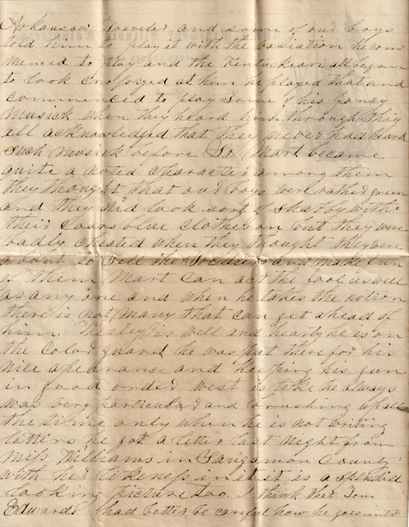 Some of our boys went down to town the other evening and Mr. Phares, [our wagon master] as they all call him, was along. They were invited into the parlor to hear some music. They played on the violin awhile and some of our boys asked Mr. [Martin] Phares if he could not play a tune or two. He said he did not know [but] he would try. They handed him the fiddle and asked him to play the Arkansas Traveler and some of our boys told him to play it with the variation. He commenced to play and the Kentuckians all began to look cross-eyed at him. He played that and commenced to play some of his family music. When they heard him through, they all acknowledged that they never had heard such music before. So Mart[in] became quite a noted character among them. They thought that our boys were rather green and they did look sort of shabby with their coarse blue clothes on but they were badly cheated when they thought they were about to sell the soldiers and make fun of them. Mart can act the fool as well as anyone and when he takes the notion, there is not many that can get ahead of him. 1