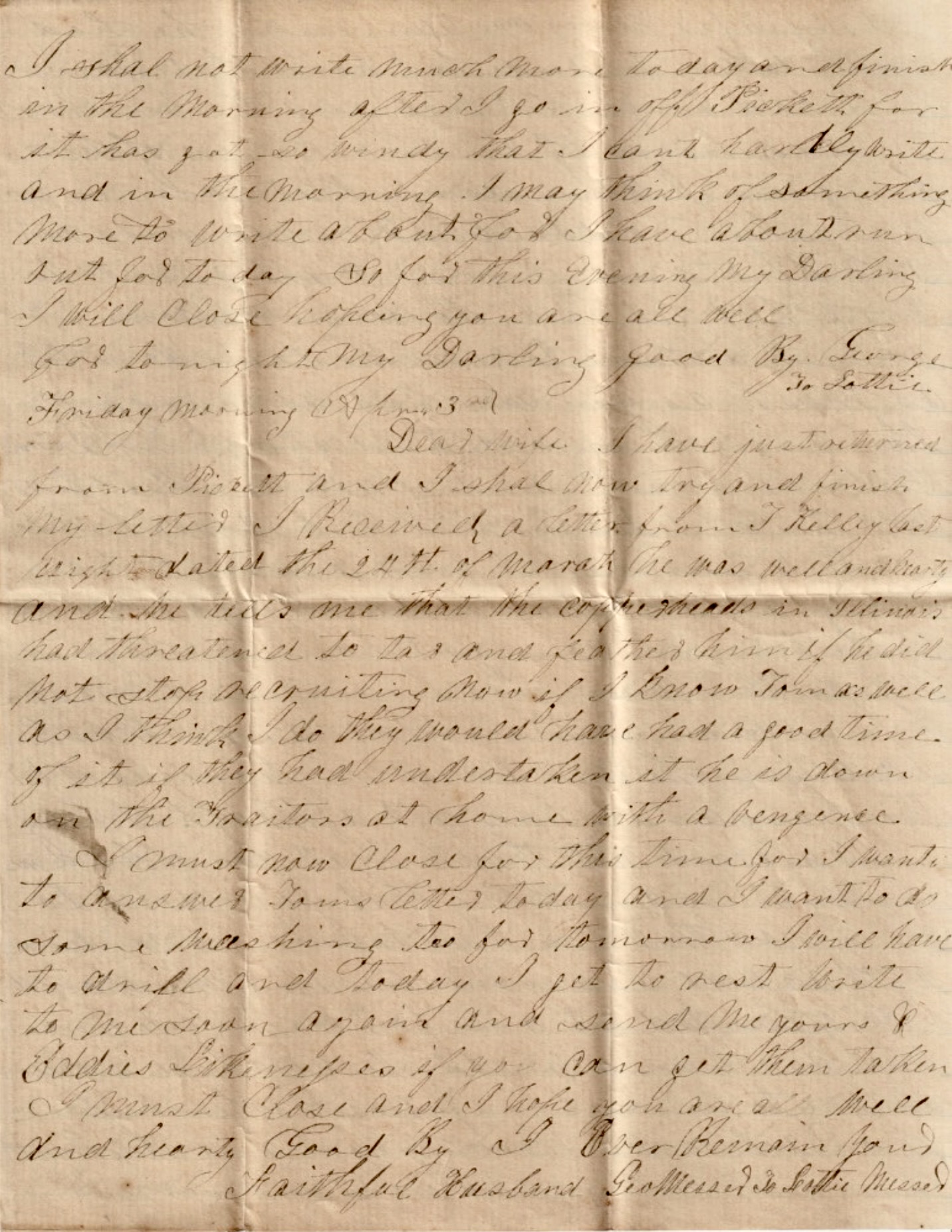 I shall not write much more today and finish in the morning after I go in off picket for it has got so windy that I can’t hardly write and in the morning I may think of something more to write about for I have about run out for today. So for this evening, my darling, I will close hoping you are all well for tonight. My darling, goodbye — George