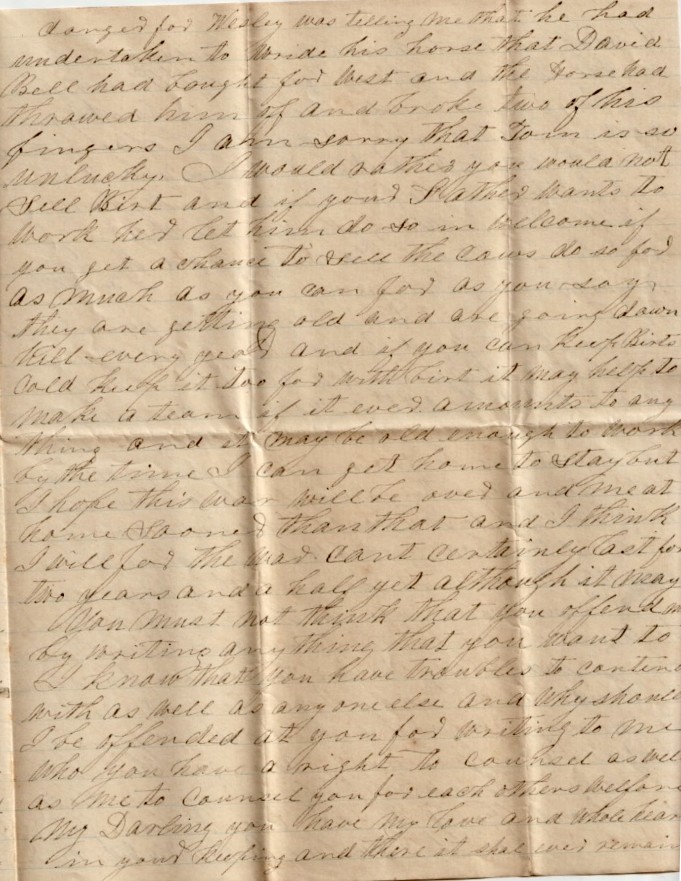 Wesley [McNulty] is well and hearty. He is on the color guard. He was put there for his nice appearance and keeping his gun in good order. West is like he always was, very particular and brushing up all the time—only when he is not writing letters. He got a letter last night from Miss Williams in Sangamon county with her likeness in it. It is a splendid looking picture too. I think that Tom Edwards had better be careful how he goes into danger for Wesley was telling me that he had undertaken to ride his horse that David Bell had bought for West and the horse had throwed him off and broke two of his fingers. I am sorry that Tomis so unlucky. I would rather you would not sell Birt and if your Father want to work her, let him do so. If you get a chance to sell the cows, do so for as much as you can for as you say, they are getting old and are going down hill every year. And if you can keep Birt’s colt, keep it too for with Birt, it may help to make a team if it ever amounts to anything and it may be old enough to work by the time I can get home to stay. But I hope this war will be over and me at home soner than that and I think I will for the war can’t certainly last for two years and a half yet, although it may.