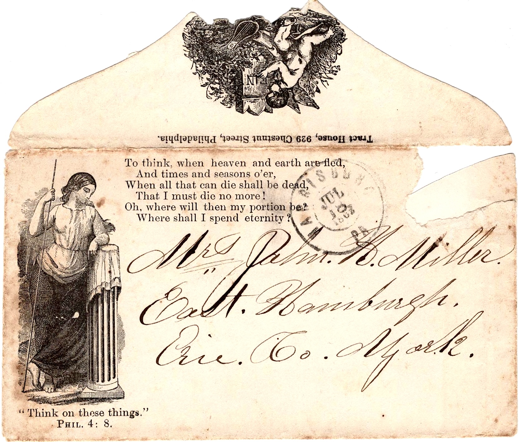 This is a fine country. Genesee no comparison. I hope this will find you well and reconciled. Only think of the condition of families left in this portion of the State compared with our own. I hope the children feel well and mind what you tell them. Johnny, be a good boy and see all is right. Tell mother not to worry herself. All is right. My love to you all. If you wish to send me any answer, please direct to Harrisburg, Pa.