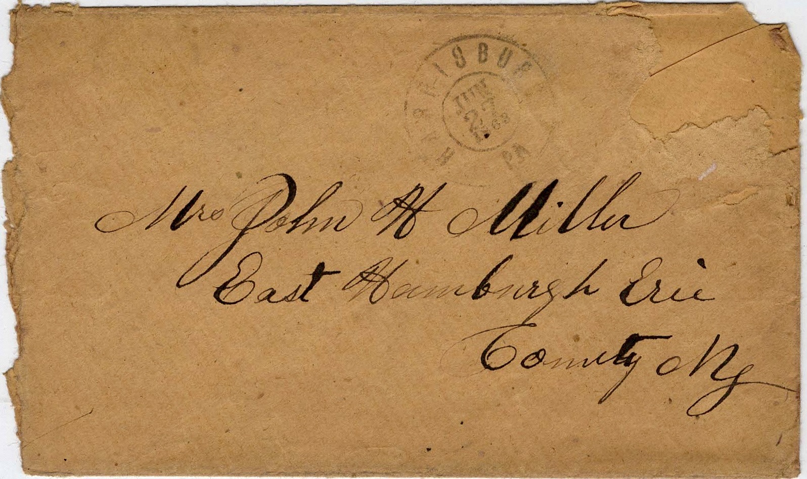 The following letters were written by John H. Miller (1827-Aft1900), a 36 year-old farmer/blacksmith from East Hamburg, Erie county, New York, while serving in Co. D, 67th New York National Guard. In 1863, the 67th New York National Guard was a regiment of Union Army infantry that served for 30 days during the summer in response to Lee’s anticipated invasion into Pennsylvania. They served from late June to early August. The 68th New York National Guard, mentioned by John in the second letter, left the State with the 67th NY National Guard on June 24, 1863, en route to Harrisburg, Pa., for a service of thirty days. It served in the 5th Brigade, 1st Division, Department Susquehanna, and was mustered out of the United States service July 29, 1863, at Elmira, N. Y.