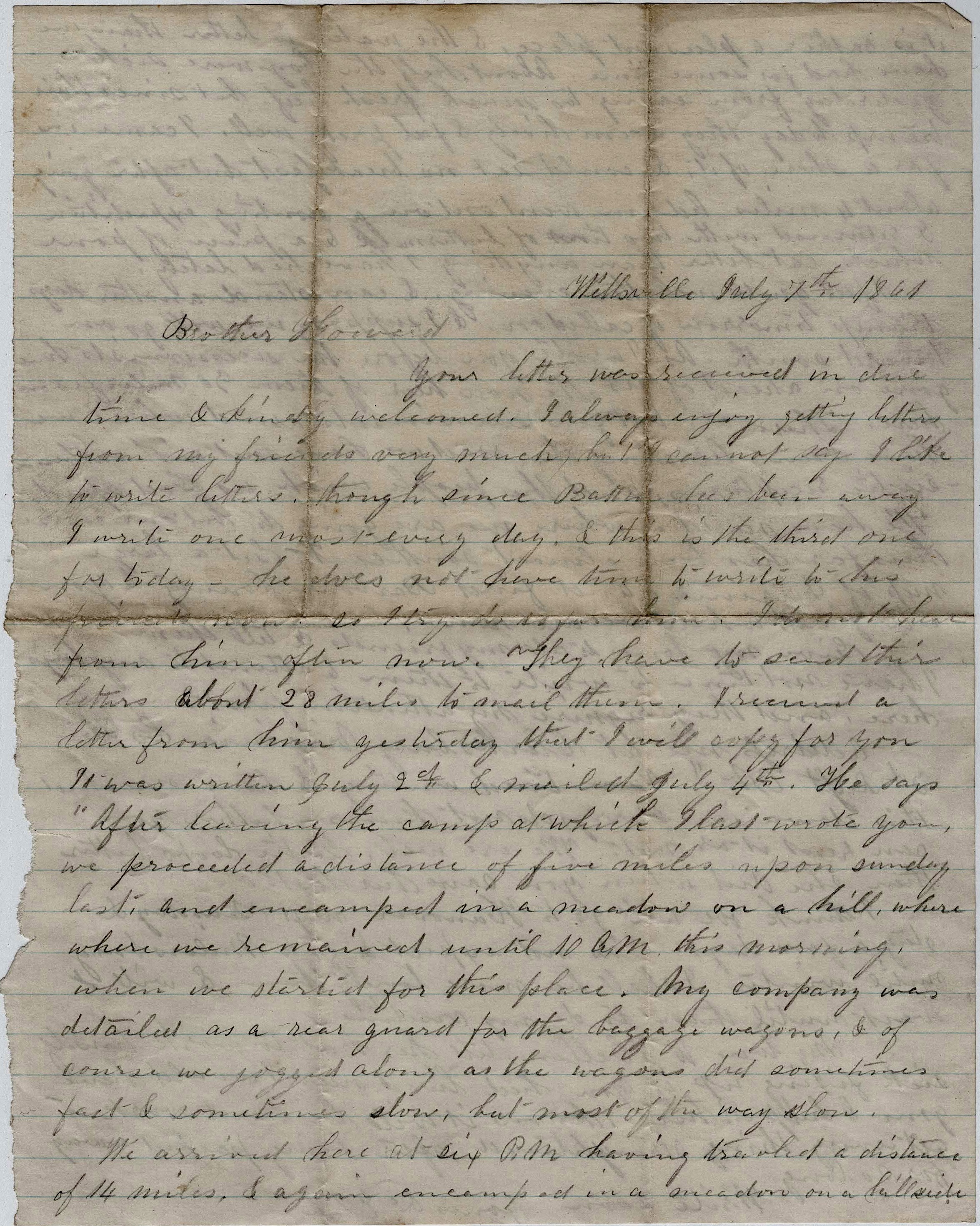 Most of Eliza’s letter was devoted to copying one from her husband who wrote her from Clarksburg, Virginia, in early July 1861 where the 3rd Ohio Volunteers were encamped. She rewrote portions of her husband’s letter because his duties as captain left him little time to write to anyone other than his wife.