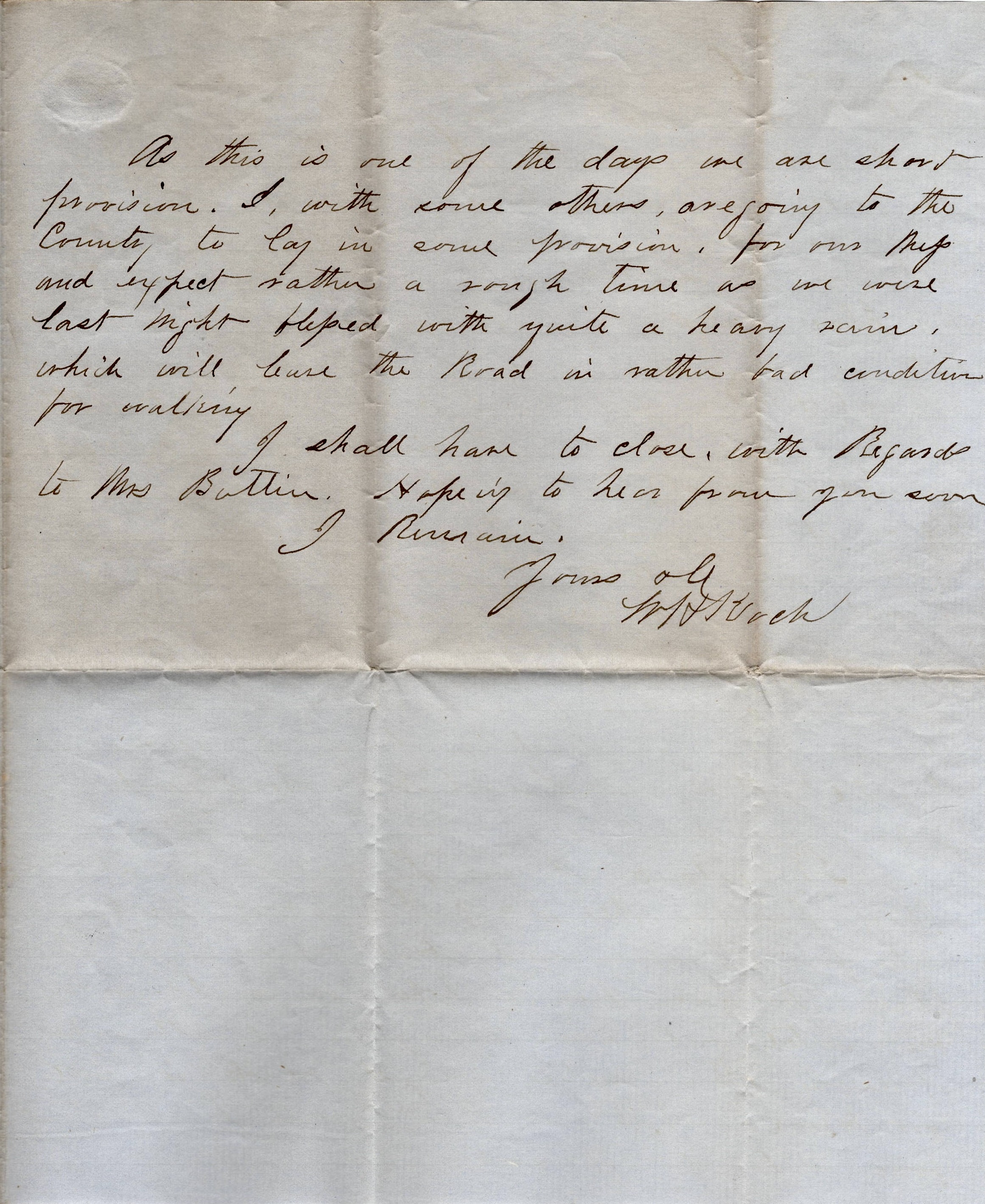 As this is one of the days we are short provision, I with some others are going to the country to lay in some provision for our mess and expect rather a rough time as we were last night blessed with quite a heavy rain which will leave the road in rather bad condition for walking. I shall have to close with regards to Mrs. Battin. Hoping to hear from you soon, I remain, yours obediently, — W. H. Koch