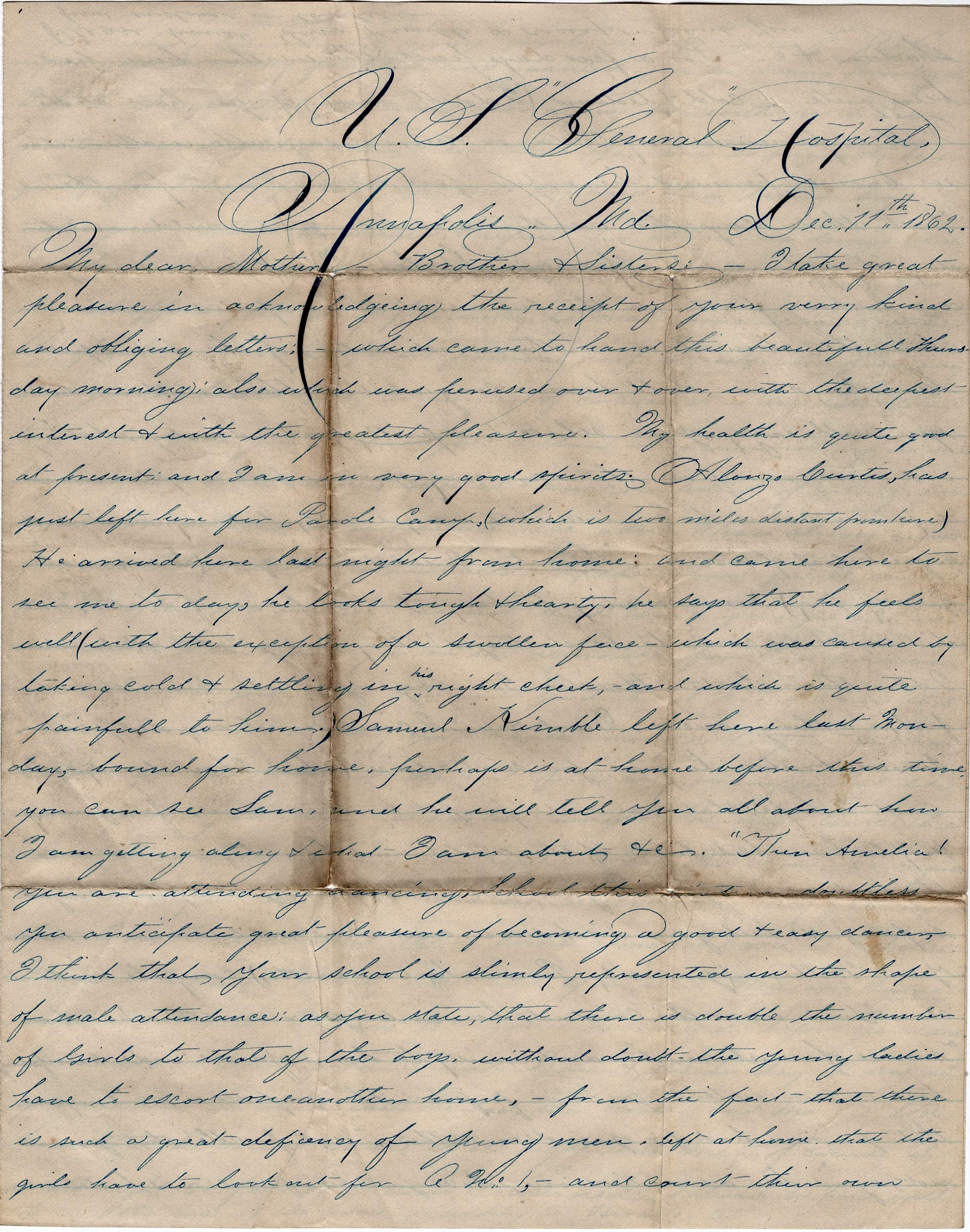 I take great pleasure in acknowledging the receipt of your very kind letters which come to hand this beautiful Thursday morning; also which was perused over & over with the deepest interest & with the greatest pleasure. My health is quite good at present and I am in very good sprits. Alonzo Curtis has just left for Parole Camp (which is two miles distant from here). He arrived here last night from home and came here to see me today. He looks tough and hearty. He says that he feels well (with the exception of a swollen face which was caused by taking cold and settling in his right cheek, and which is quite painful to him). Samuel Kimball left here last Monday bound for home. Perhaps is at home before this time. You can see Sam and he will tell you all about how I am getting along & what I am about, &c.