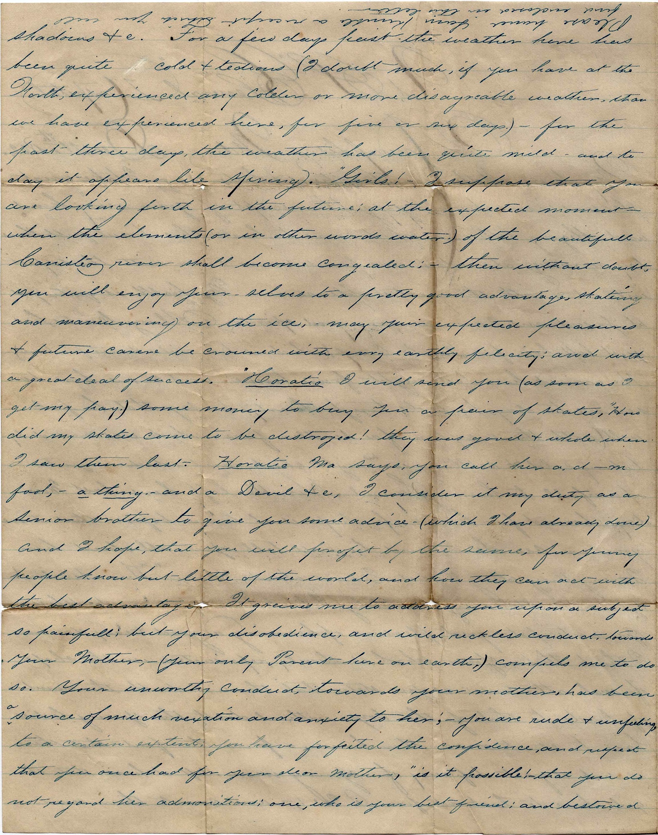 Horatio, I will send (as soon as I get my pay) some money to buy you a pair of skates. How did my skates come to be destroyed! they was good & whole when I saw them last. Horatio, Ma says you call her a damn fool, a thing and a Devil, &c. I consider it my duty as a senior brother to give you some advice (which I have already done) and I hope that you will profit by the same, for youg people know but little of the world, and how they can act with the best advantage. It grieves me to address you upon a subject so painful, but your disobedience and wild, reckless conduct towards your Mother (your only parent here on earth) compels me to do so. Your unworthy conduct towards your mother has been a source of much vexation and anxiety to her. You are rude and unfeeling to a certain extent. You have forfeited the confidence and respect that you once had for your dear mother. Is it possible that you do not regard her admonitions; one, who is your best friend; and bestows upon you so many facilities and granted you so many privileges. I little thought that you would ever repay her with such ingratitude and wicked acts in which you have so frequently been guilty of. I do hope that you wil try and be a better boy. Ask your mother’s forgiveness & repent for the wrong doings which you have been guilty of. Be more penitent in the future for it will afford you an opportunity to make amens and retrieve the past. Having left the paternal roof myself and gone away to fight the battles of my country, of course it is my duty to entice & persuade you to do right. I think it incumbent upon me to give you a little advice, such as I am confident of giving from my own observation and experience. The advice I have already given you and I hope that you will abide by the same for it will be for your own interest. Do not think hard of me for the advice which I have given you, or the reproval for it is for your own and personal good, and you will find it out so. I know that I have never set a very good and wise example to you, but now I repeat for the same, so do not follow my example but likewise repent yourself and do better hereafter. The next time that I hear from home, I am in hope to hear that you are a good boy. So may it be.