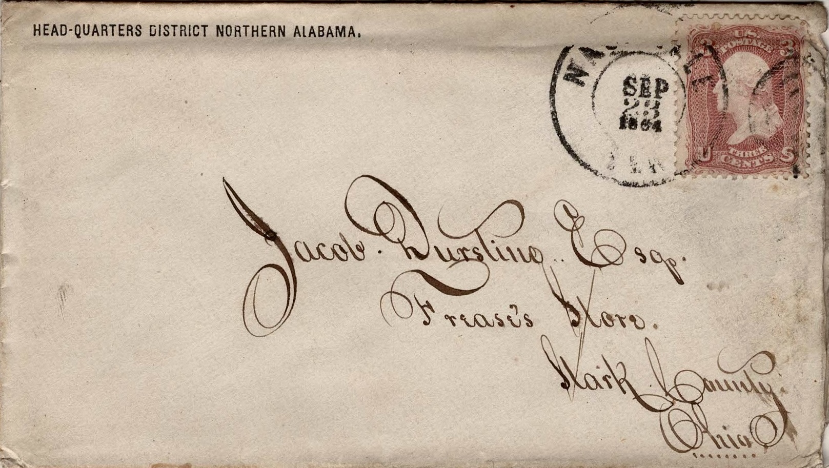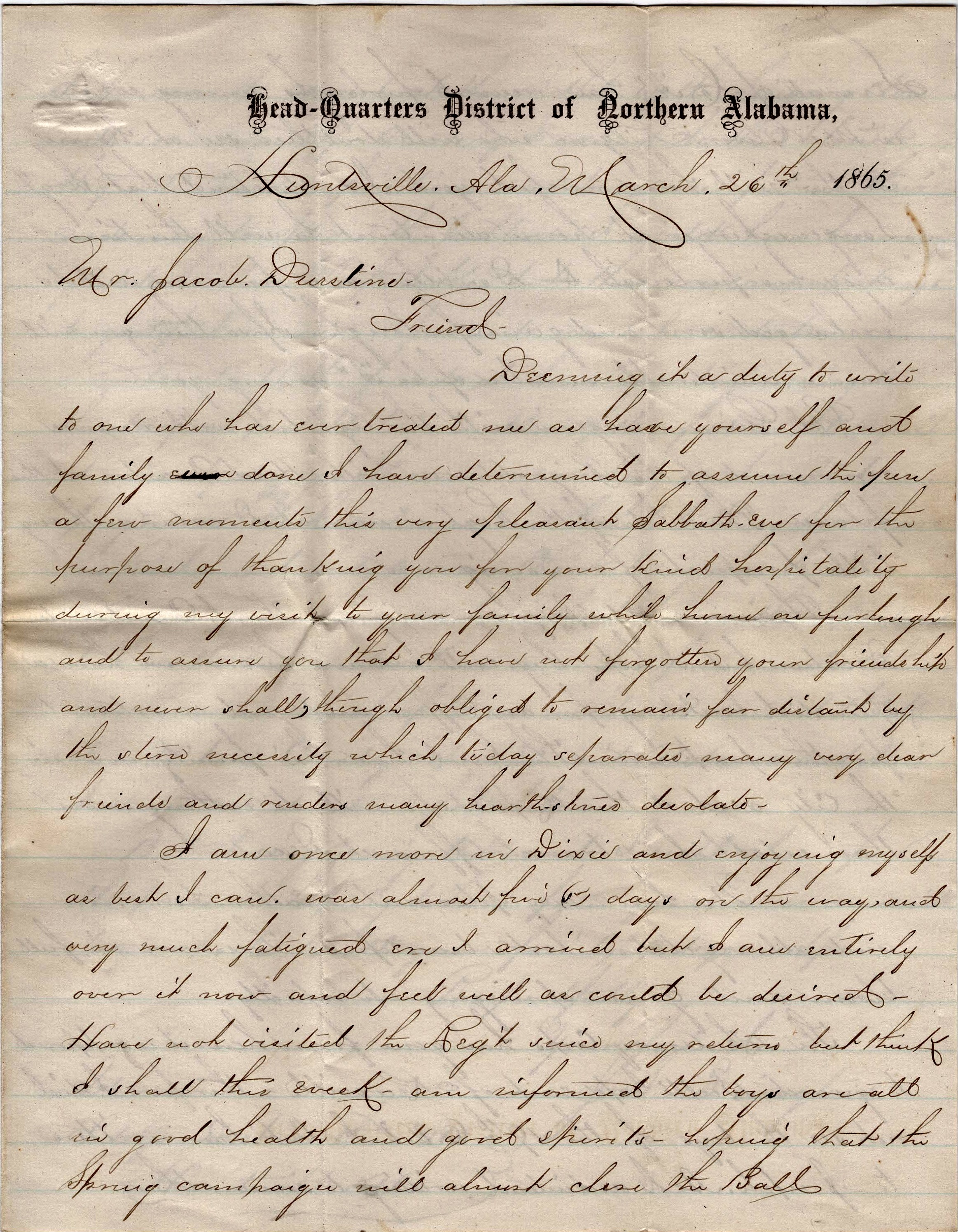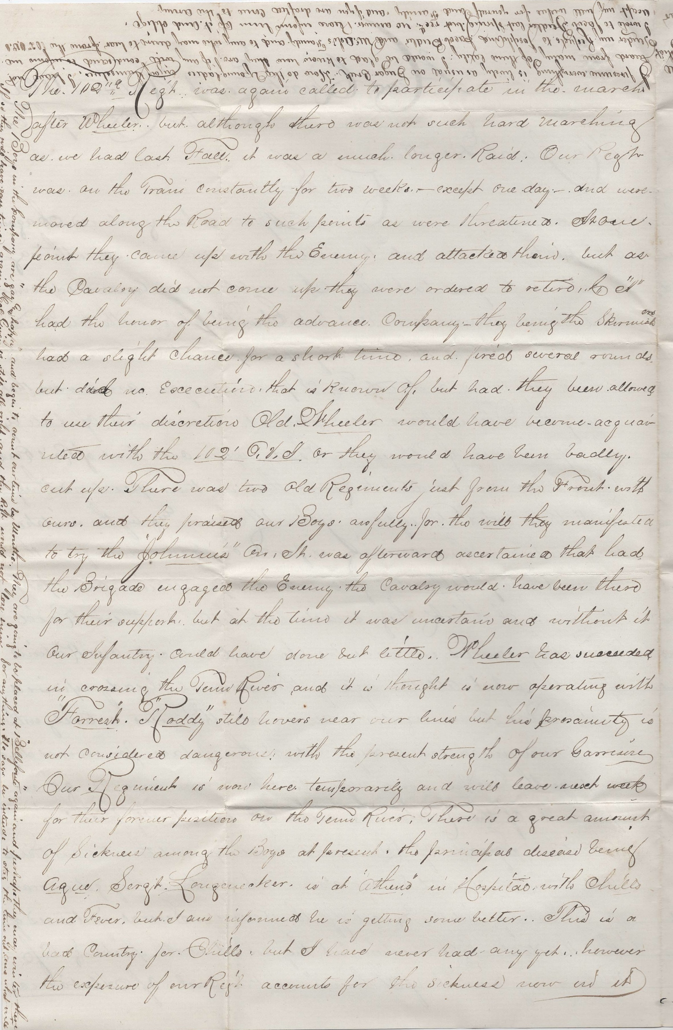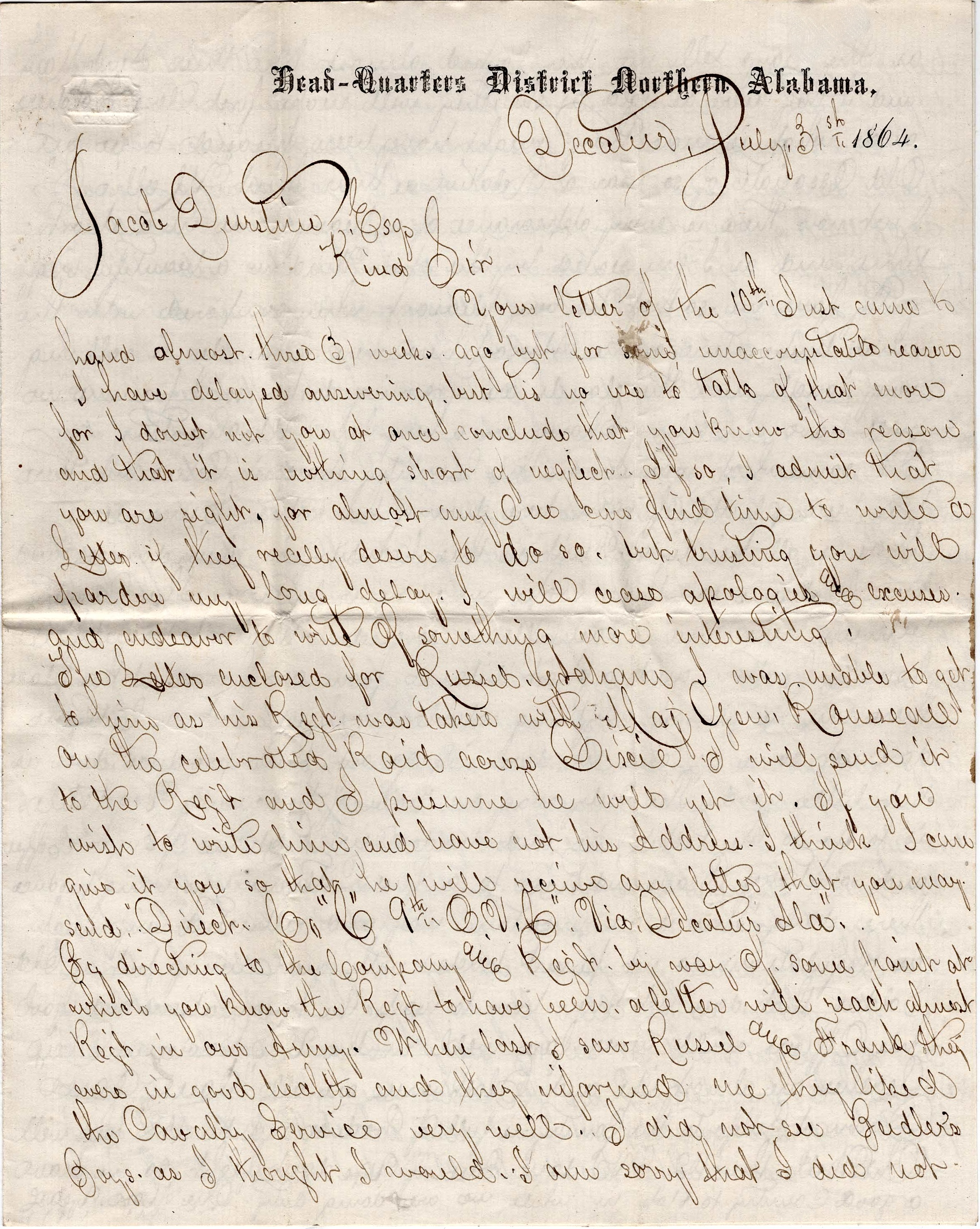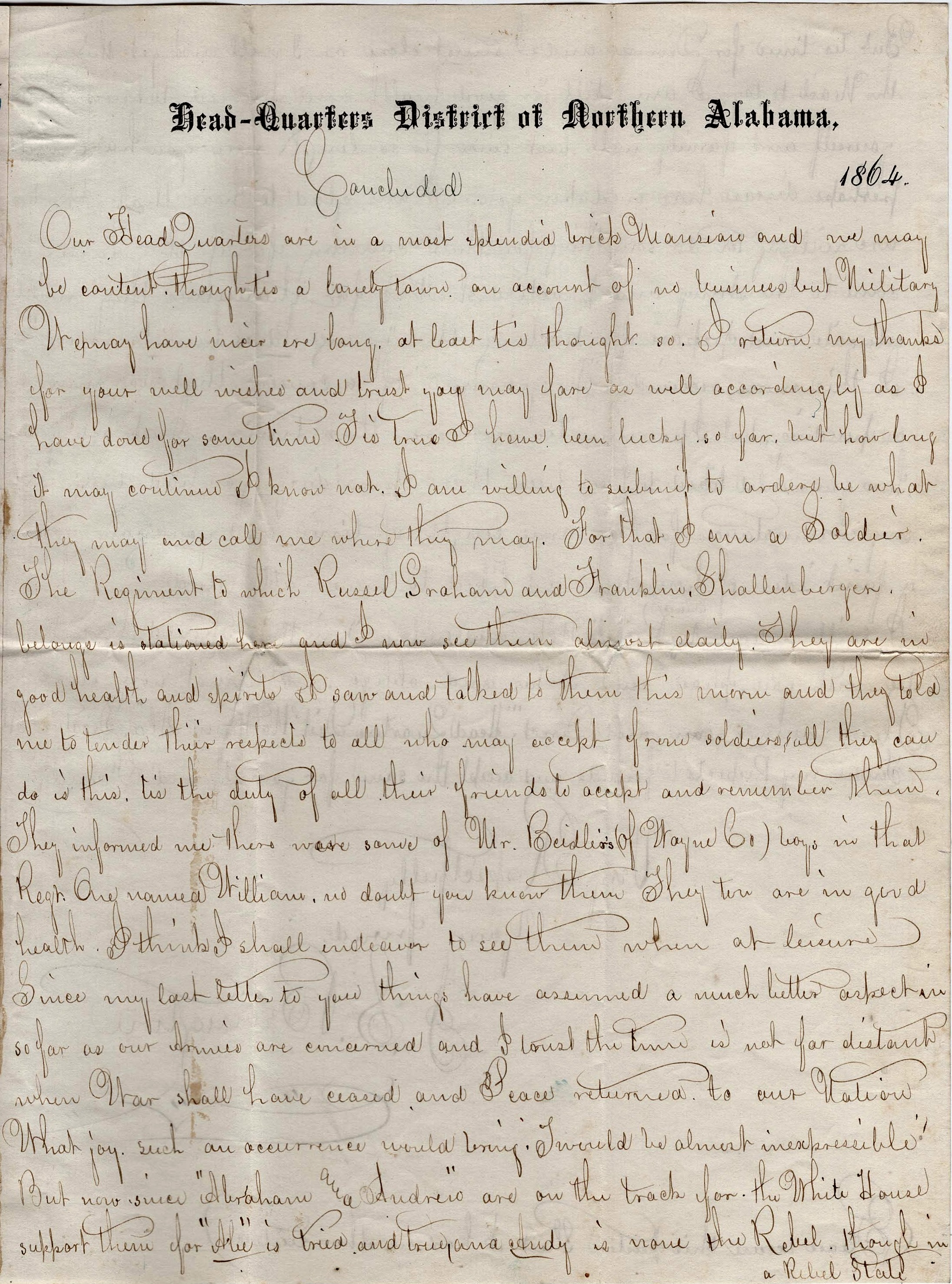 Kind sir, after a long silence I again attempt to communicate to you in some manner something in answer to your last letter. I would have answered sooner had circumstances permitted but Gen. Wheeler with his forces is a circumstance that is very apt to prevent communication where he takes a stand and I presume you are aware that we of this District have been troubled considerable of late by the operations of Wheeler & Roddy upon our line of railroad. However, we are content to know that in their operations they lost their noted chieftain John Morgan and by the mistake committed in their coming so far to the our rear and from their main army Atlanta fell into our possession and upon the whole I think they made but little in their raid. True, they caused us some trouble and reduced our rations for a time, but all the injury they done is already repaired and trains come regularly as usual. We were entirely without communication of any kind at this place for several days and as the troops were near all taken from here to go in pursuit of the Rebels, we were left in a pretty peculiar situation. Squads of Rebs would come up and threaten our pickets and then there would be an alarm. At one time they got in rear of our cavalry videttes and cut off the reserve. Several instances of their threats I might mention but they are not worth speaking of. We have any amount of “Johnnies” in this part of Alabama.