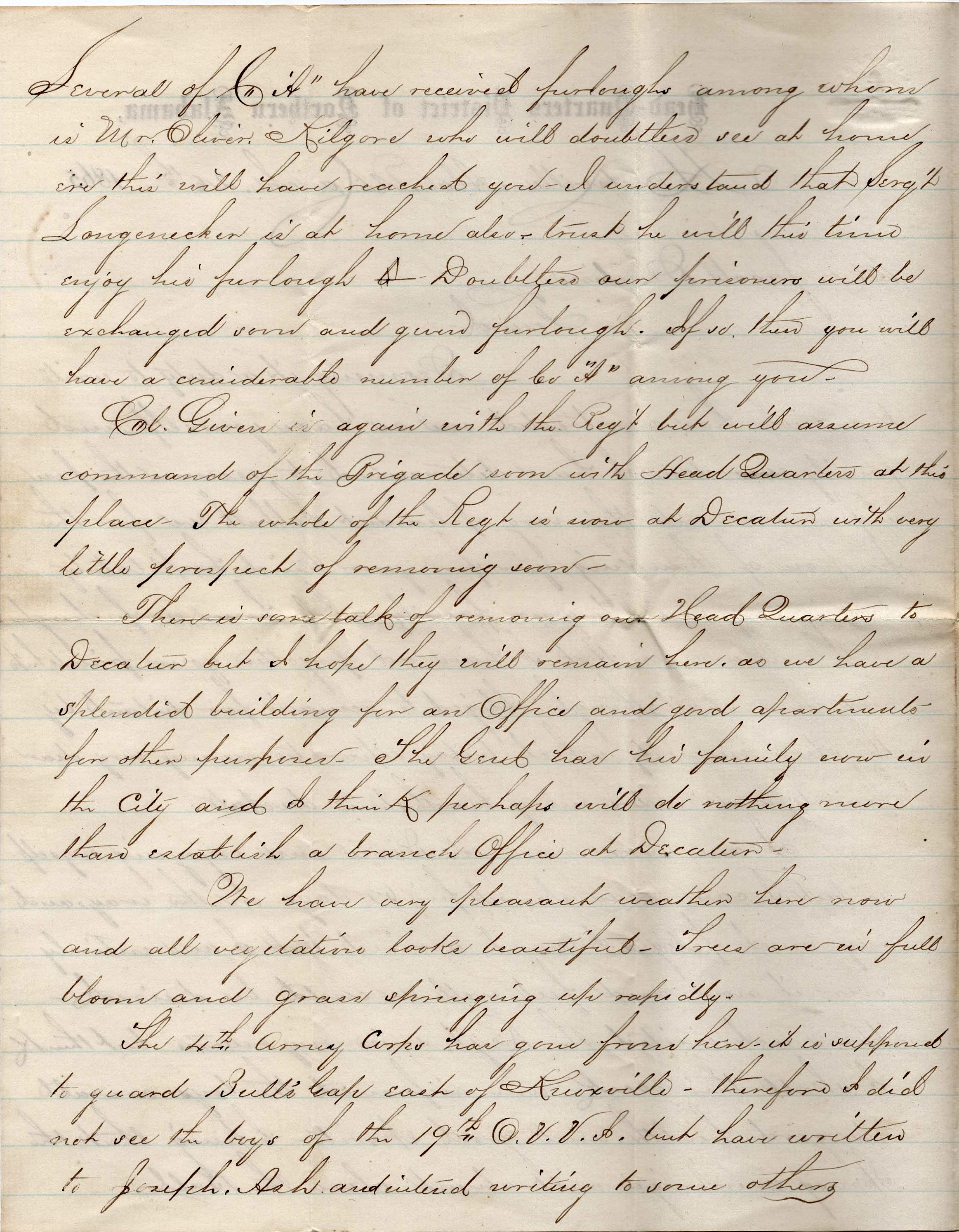 Col. Given is again with the regiment but will assume command of the Brigade soon with Headquarters at this place. The whole of the regiment is now at Decatur with very little prospect of removing soon.