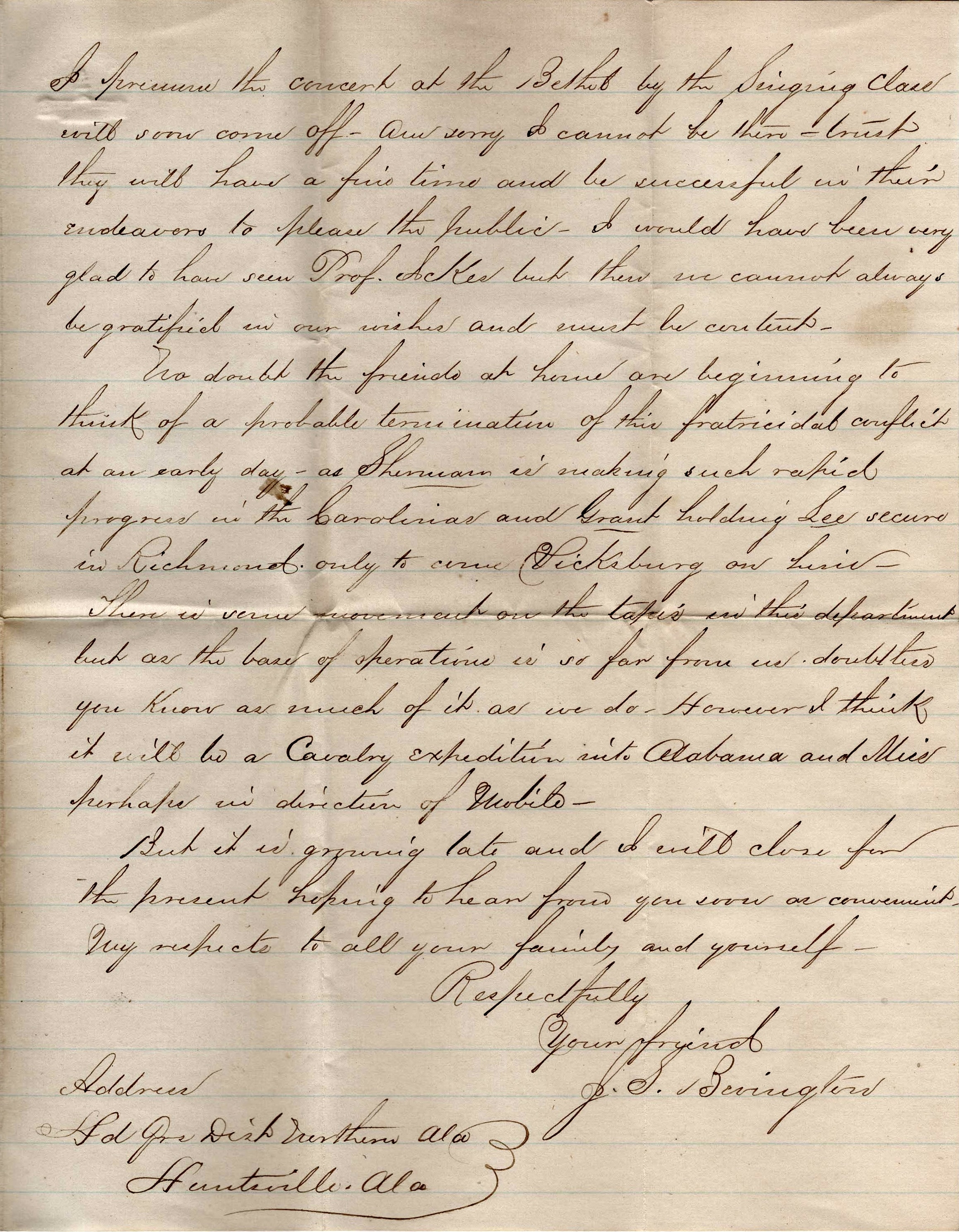I will endeavor to answer Rachel’s note and enclose it in this. Should she not yet be with you, please send it to her and oblige. I must now close. Please answer soon and direct, “Headquarters Dist. Northern Alabama”, Decatur, Alabama” Tender my respects to friends and accept the same for yourself and family. Very respectfully your friend, — J. S. Bevington