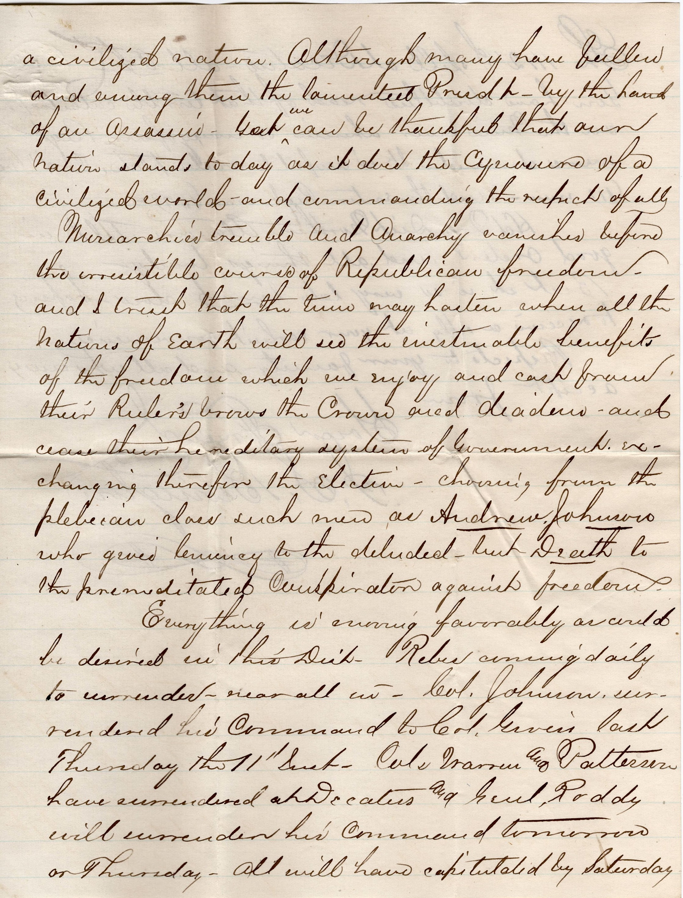 But enough of this ridiculous. It appears that our country has at last emerged from the troubled waters of civil strife and are purified by the immersion—however, allow to remark here that you must not infer that I admit the divinity of immersion as the only source whereby the unclean are cleansed—and now stand for to the astonished world to vindicate the doctrines that man is capable of self government and to promulgate the sentence of treason and traitors in the overthrow of rebellion and execution of instigators and perpetrators of the foulest deeds that ever disgraced the history of a civilized nation. Although many have fallen and among them the lamented President by the hand of an assassin, yet we can be thankful that our nation stands today as it does—the cynosure of a civilized world and commanding the respect of all. Monarchies tremble and anarchy vanishes before the irresistible course of Republican freedom. And I trust that the time may hasten when all the nations of Earth will see the inestimable benefits of th freedom which we enjoy and cast from their Ruler’s brows the crown and diadem and cease their hereditary system of government, exchanging therefor the election—choosing from the plebeian class such men as Andrew Johnson who gives leniency to the deluded, but death to the premeditated conspirator against freedom.