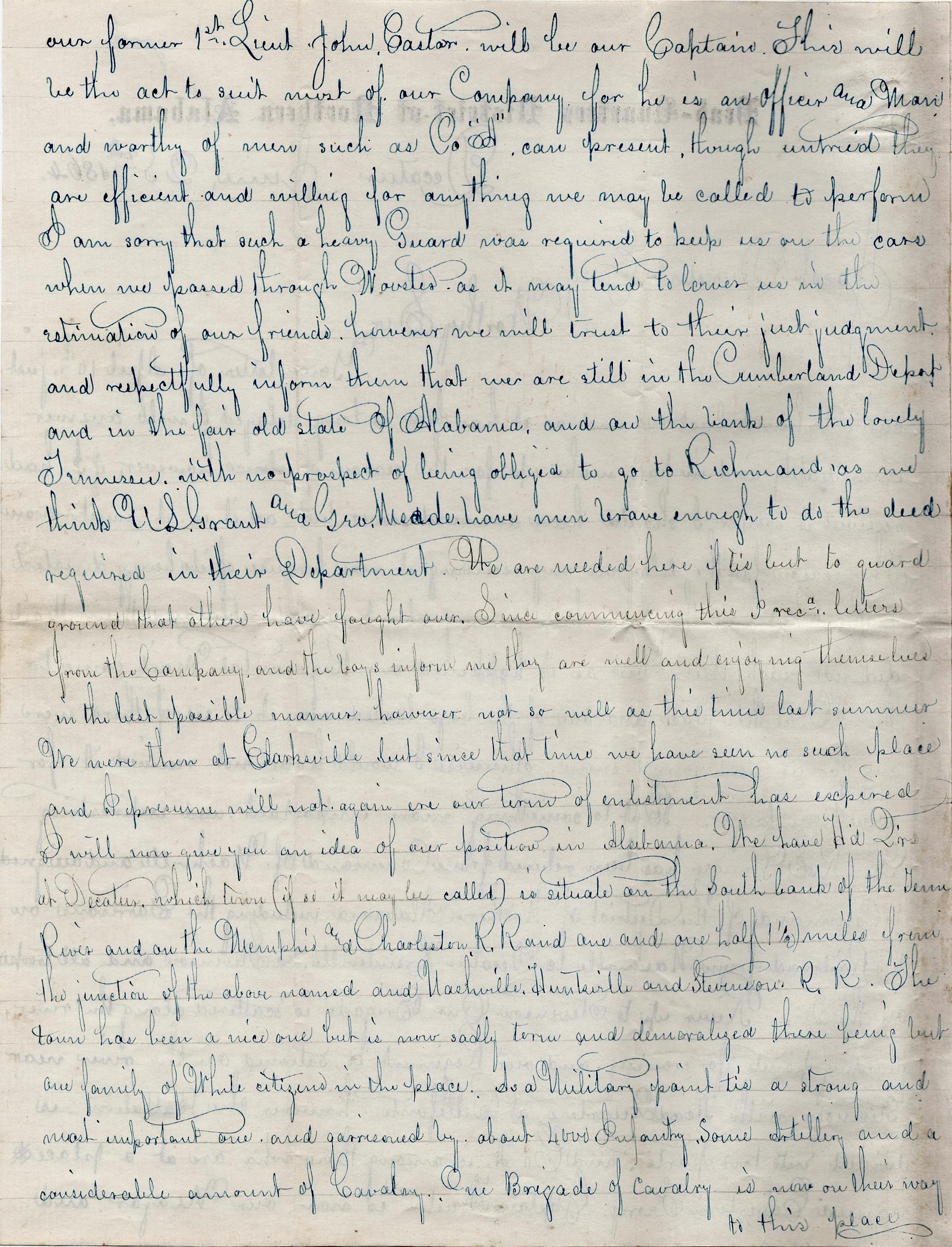 I am sorry that such a heavy guard was required to keep us on the cars when we passed through Wooster as it may tend to lower us in the estimation of our friends, However, we will trust to their just judgement and respecfully inform them that we are still in the Cumberland Dept and in the fair old state of Alabama, and on the bank of the lovely Tennessee with no prospect of being obliged to go to Richmond as we think U. S. Grant and George Meade have men brave enough to do the deed required in their Department. We are needed here if tis but to guard ground that others have fought over.