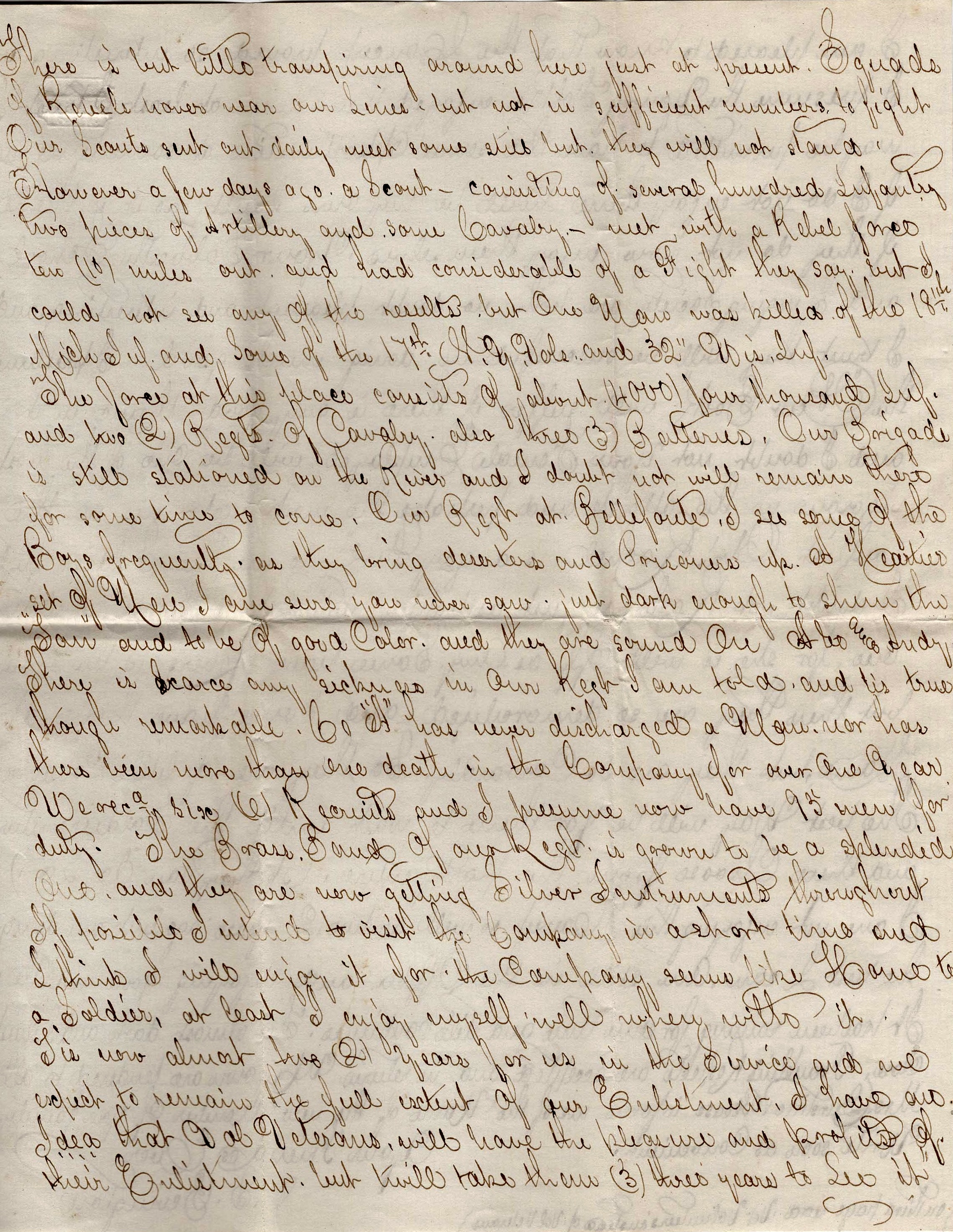 The force at this place consists of about four thousand infantry and two regiments of cavalry, Also three batteries, Our Brigade is still stationed on the river and I doubt not will remain there for some time to come. Our regiment [is] at Bellefonte. I see some of the Boys frequently as they bring deserters and prisoners up, A heartier set of men I am sure you never saw—just dark enough to shun the “Tan” and to be of good color and they are sound on Abe & Andy.