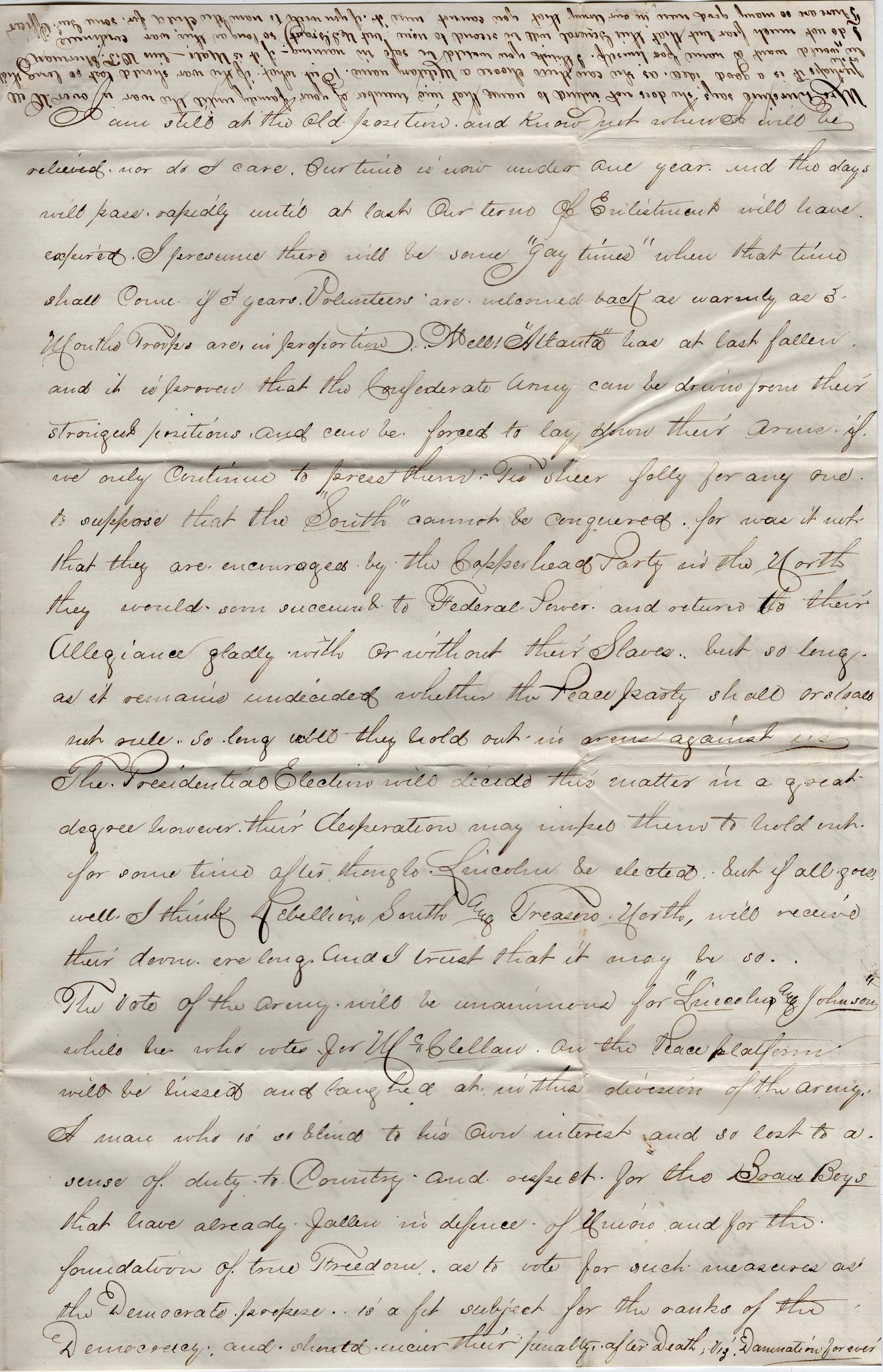 The Presidential election will decide this matter is a great degree. However, their desperation may impel them to hold out for some time after though Lincoln be elected. But if all goes well, I think Rebellion South & Treason North will receive their doom ‘ere long, and I trust that it may be so. The vote of the army will be unanimous for “Lincoln & Johnson” while he who votes for McClellan on the Peace platform will be hissed and laughed at in this division of the army. A man who is so blind to his own interest and so lost to a sense of duty to country and subject for the Brave Boys that have already fallen in defense of the Union and for the foundation of Freedom as to vote for such measures as the Democrats propose is a fit subject for the ranks of the Democracy and should incur their penalty after death—viz: Damnation forever.