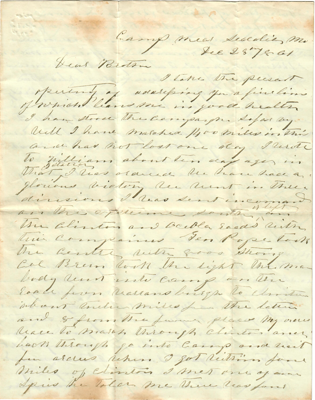I take the present opportunity of addressing you a few lines which leaves me in good health. I have stood the campaign so far very well. I have marched 1400 miles in this and has not lost one day. I wrote to Wm. about ten days ago. In that I stated I was ordered. We have had a glorious victory. We went in three divisions. I was sent in command on the extreme southern or left on the Clinton [Henry Co.] and Osceola [St Clair Co.] roads with two companies. Gen. Royce took the center with 8,000 strong. Col. Brim took the right. The main body went into camp on the road from Warrensburg [Johnson Co.] to Clinton, about twelve miles from the latter and 8 from the former place. My orders were to march through Clinton and back through, go into camp and wait for orders.