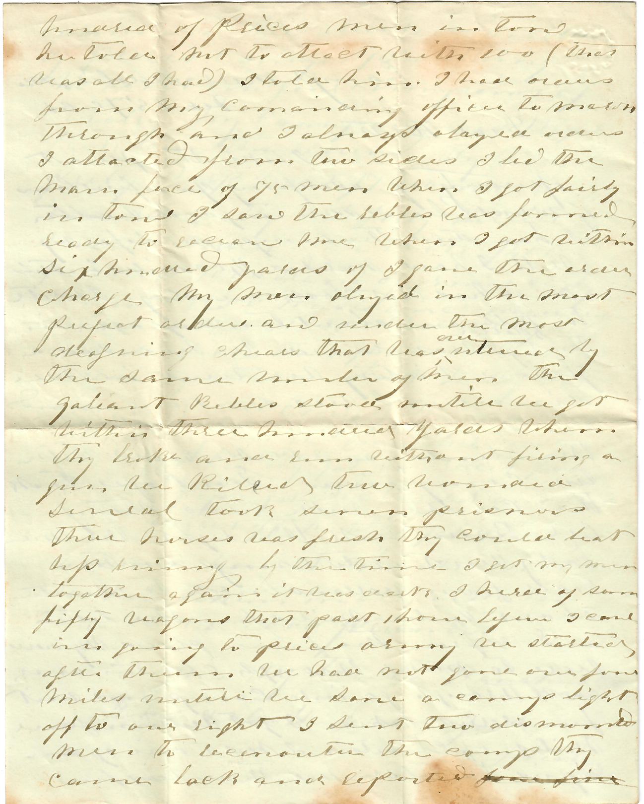 I got within four miles of Clinton. I met one of our spies. He told me there was four hundred of Price’s men in town. He told me not to attack with 100 men (that was all I had). I told him I had orders from my commanding officer to march through and I always obeyed orders. I attacked from two sides. I led the main force of 75 men. When I got fairly in town I saw the rebels was formed ready to redan me. When I got within six hundred yards, I gave the order, “Charge!” My men obeyed in the most perfect order and under the most deafening cheers that was ever uttered by the same number of men. The gallant Rebels stood until we got within three hundred yards when they broke & ran without firing a gun. We killed two, wounded several, and took some prisoners.