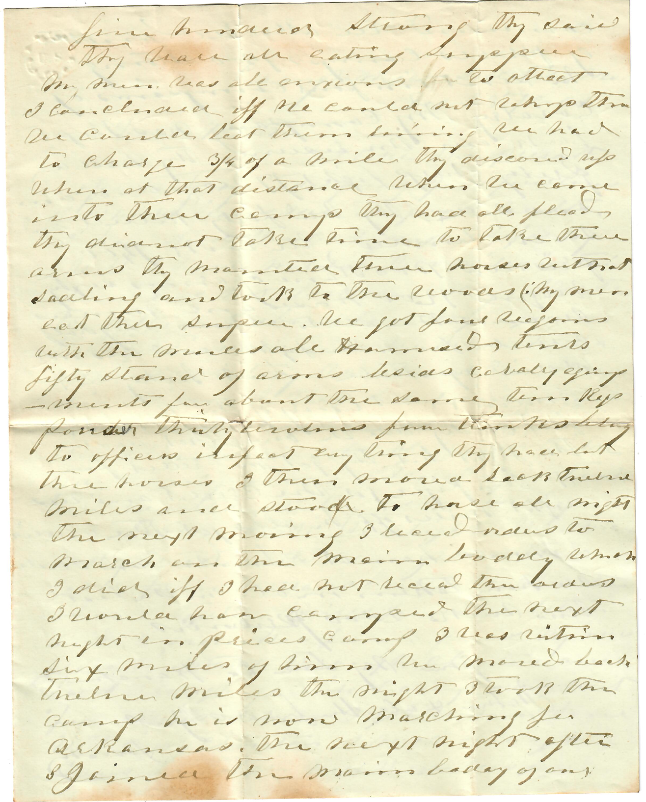 Their horses was fresh. They could beat us running. By the time I got my men together again it was dark. I heard of some fifty wagons that passed one hour before. I came in going to Price’s army. We started after them. We had not gone over four miles until we saw a camp light off to our right. I sent two dismounted men to reconnoiter the camp. They came back & reported five hundred strong. They said the men were eating supper. My men was all anxious to attack. I concluded if we could not whip them, we could beat them running. We had to charge ¾ of a mile. They discovered us when at that distance. When we came into their camp they had all fled. They didn’t take time to take their arms. They mounted their horses without saddling and took to the woods. My men ate their supper.