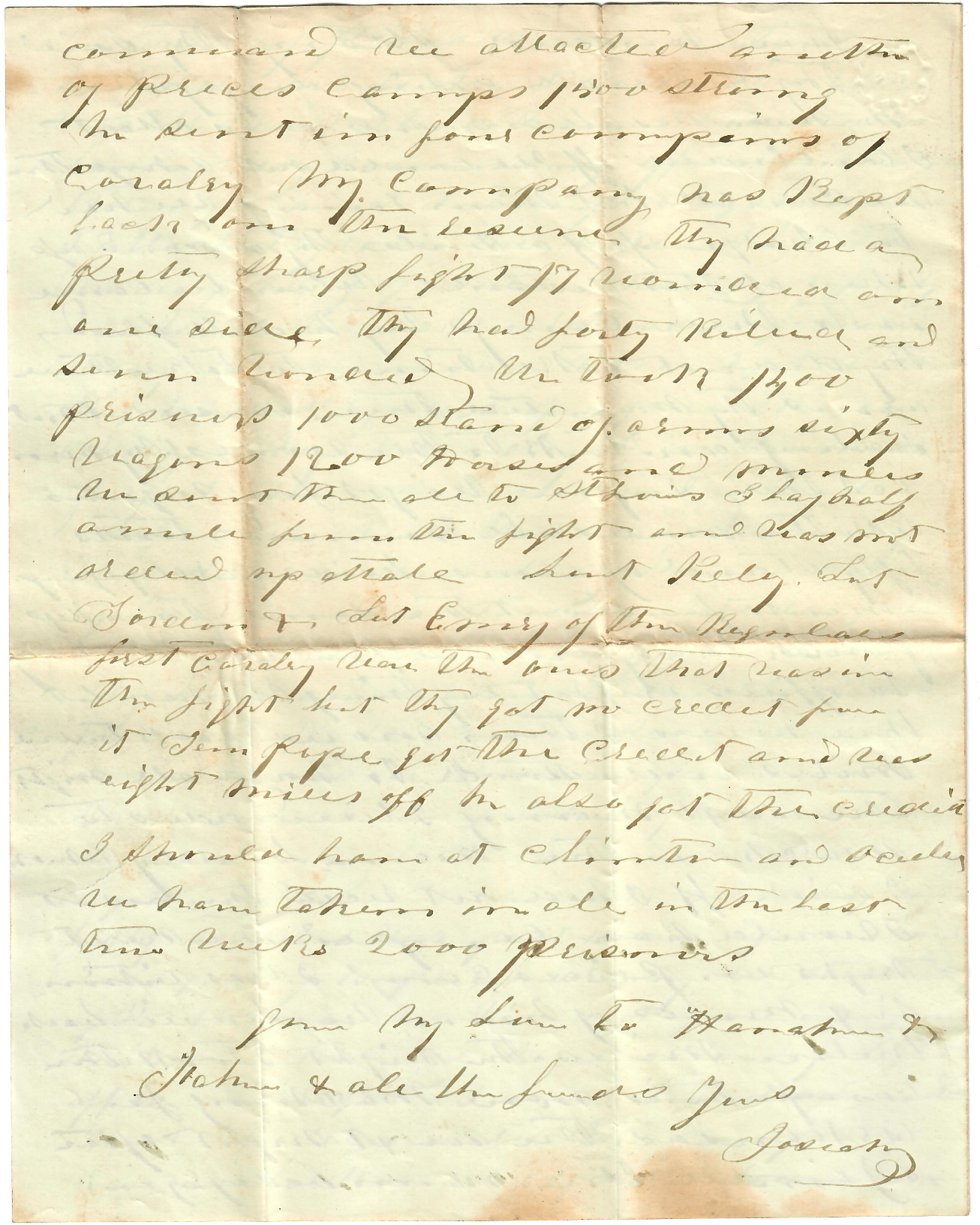 We got four wagons with the mules all harnessed, tents, fifty stands of arms besides cavalry equipment for about the same, ten kegs of powder, thirty [ ], four trunks belonging to officers, in fact, everything they had but their horses. I then moved back twelve miles and stood to horse all night. The next morning I received orders to march on the main body which I did. If I had not received the orders I would have camped the next night in Price’s camp. I was within six miles of him. We moved back twelve miles the night we took their camp. He is now marching for Arkansas. The next night after I joined the main body of our command we attack another of Price’s camps, 1500 strong. We sent in four companies of cavalry. My company was kept back on the reserve. They had a pretty sharp fight—seventeen wounded on our side. They had forty killed and seven wounded. We took 1400 prisoners, 1,000 stands of arms, sixty wagons, 1200 horses & mules. We sent them all to St Louis. I lay half a mile from the fight and was not ordered up at all. Lieut. Kelly, Lieut. Jordon & Lieut. Emory of the Regular first cavalry was the ones that was in the fight, but they got no credit from it. Gen. Royce got the credit and was eight miles off. He also got the credit I should have had at Clinton & Osceola. We have taken in all in the last two weeks 2000 prisoners.Give my love to Hannah & Father & all the friends. — Yours, Josiah
