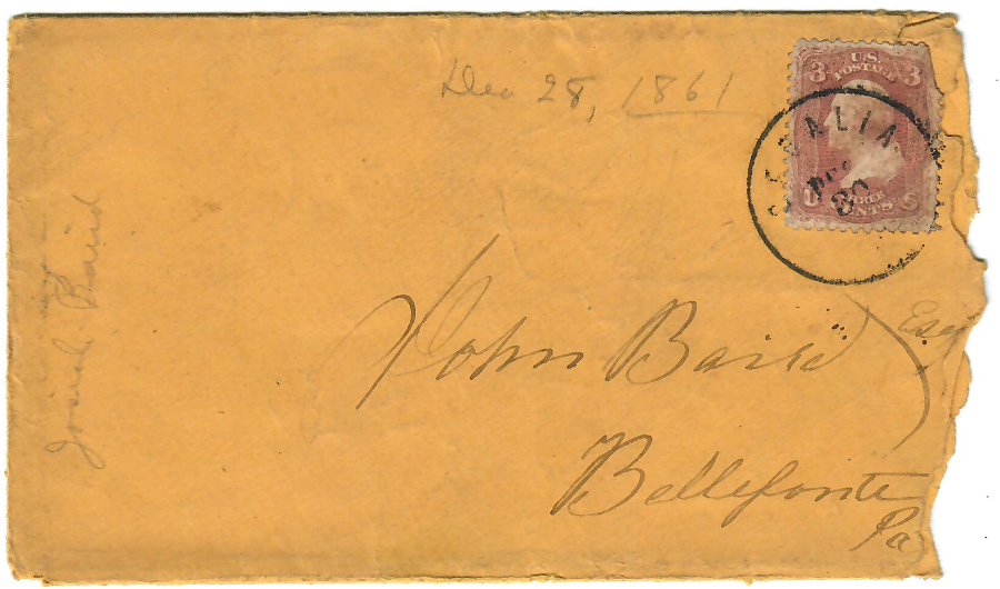 On May 11, 1858, Josiah wrote a letter to his father from Clearfield, Pa. It reads in part: “I take up my pen to inform you how I am getting along in the getting ready to go West. Times is a great deal harder than I thought or when I was to see you last. I have fell short considerably of what I expected to go West with. I have tried to get money on a loan. I offered 15% but could not raise it. If you could raise me $50 for 3 or 4 months, I would be willing to pay 10% rather than not get it. I have a lien that I can half collect in 4 months which I could raise the money for you in that time. I have rented my house and has taken no work so I am obliged to do something. I can’t afford to pay board and do nothing. There is no work to be had now. Had I known this 2 months ago I might have had some jobs. We are all well. Mary joins in sending her love to you, John & Hannah. Nothing more but remains. Your affectionate son, Josiah Baird”