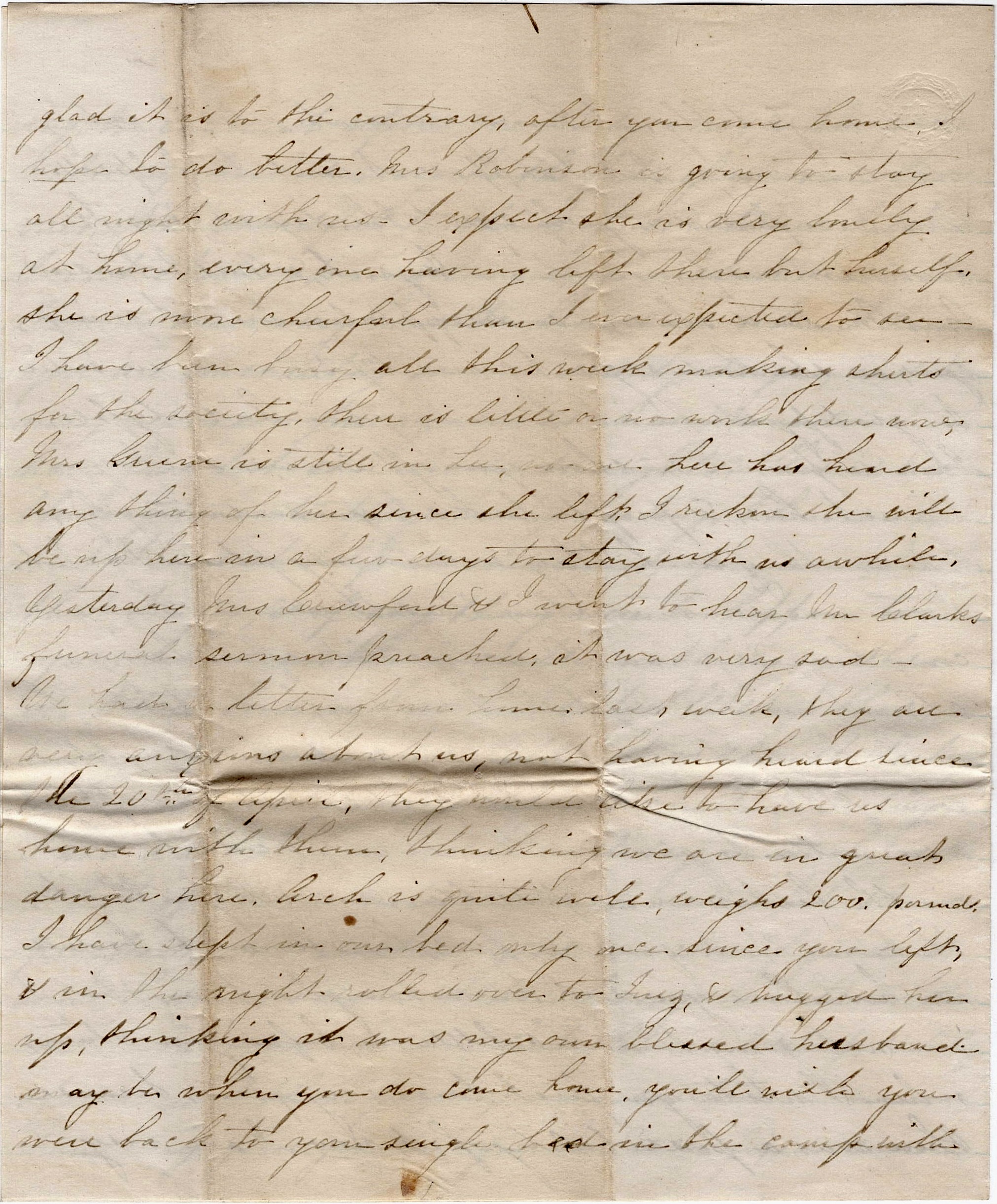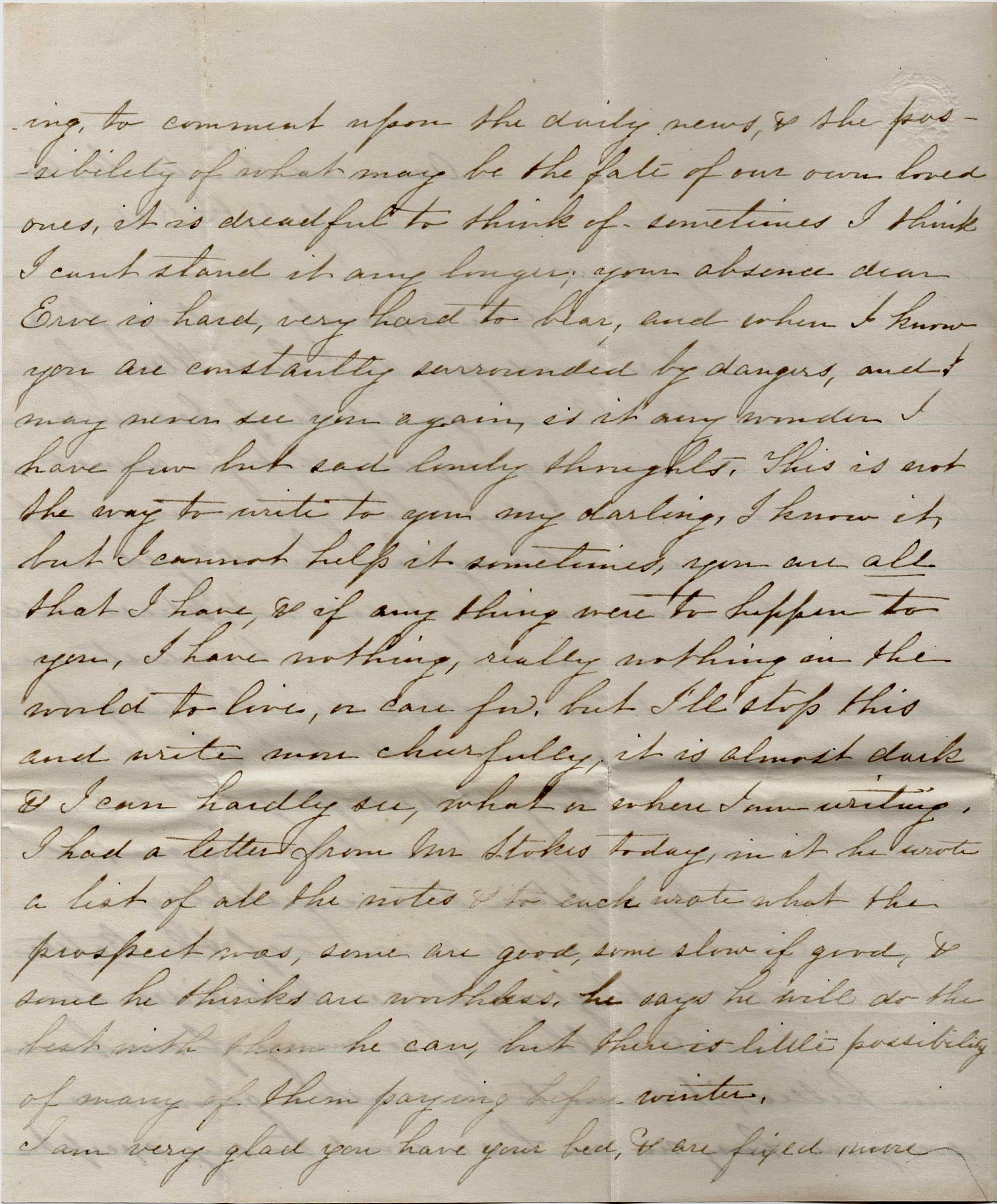 My pen is so miserable I can scarcely write. I must not mind looks though—especially now, so my own darling excuse both the composition and writing. I will supply myself with a new pen next time & hope my brain will be more active. Mrs. Robinson, Inez, Mollie, and Lou all send a great deal of love to you. Do write very soon. Every line from you is a comfort and blessing to me. God bless & keep you my darling and bring you home safe to your own true & loving wife, — Em