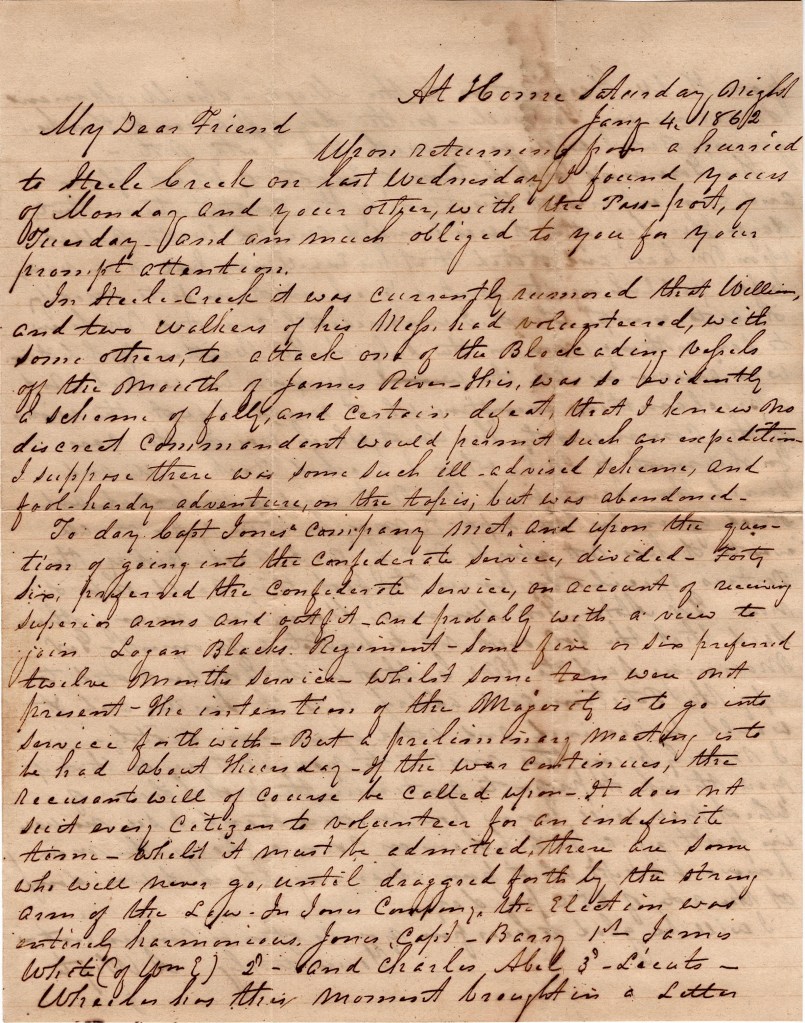 Today Capt. Jones’s company met and upon the question of going into the Confederate service, divided. Forty-six preferred the Confederate service of account of receiving superior arms and outfit—and probably with a view to join Logan Black’s Regiment [1st S. C. Cavalry]. Some five or six preferred twelve months service whilst some ten were not present. The intention of the majority is to go into service forthwith, but a preliminary meeting is to be had about Thursday. If the war continues, the [ ] will of course be called upon. It does not suit every citizen to volunteer for an indefinite time. Whilst it must be admitted there are some who will never go until dragged forth by the strong arm of the law. In Jones’ company, 1 the election was entirely harmonious. [Robin C.] Jones, captain. [James H.] Barry, 1st. James White (of Wm E) 2nd. and Charles Abel, 3rd Lieutenants.