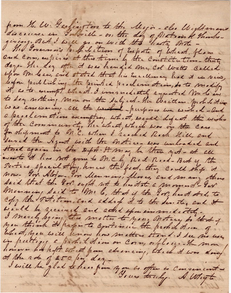 The Governor’s prohibition of exports of wheat, flour and corn expires at this time by the Constitution—thirty days. The day after it was handed me, Col. Watts called upon McCaw and stated that his excellency had it in view, before publishing the printed proclamation so to modify it, as to exempt wheat. I immediately requested McCaw to say nothing more on the subject. The written prohibition was answering all the purposes we wished, and a proclamation exempting wheat would defeat the wishes of the community. The wheat, which was on the cars for shipment to North Carolina when I reached Rock Hill, and served the Agent with the notice, was unloaded and stored again in the depot. It may be there yet. At all events, it has not gone to North Carolina by railroad. But if the parties speculating knew the fact, they could ship it now. Gov. [Robert F. W.] Alston, Gov. [John Lawrence] Manning, [Franklin J.] Moses, and any others said that the Governor would not hesitate a moment. Gov. Manning said to McC. that if the governor hesitated, to copy the petition and address it to the Senate, and it would be received and acted upon immediately.