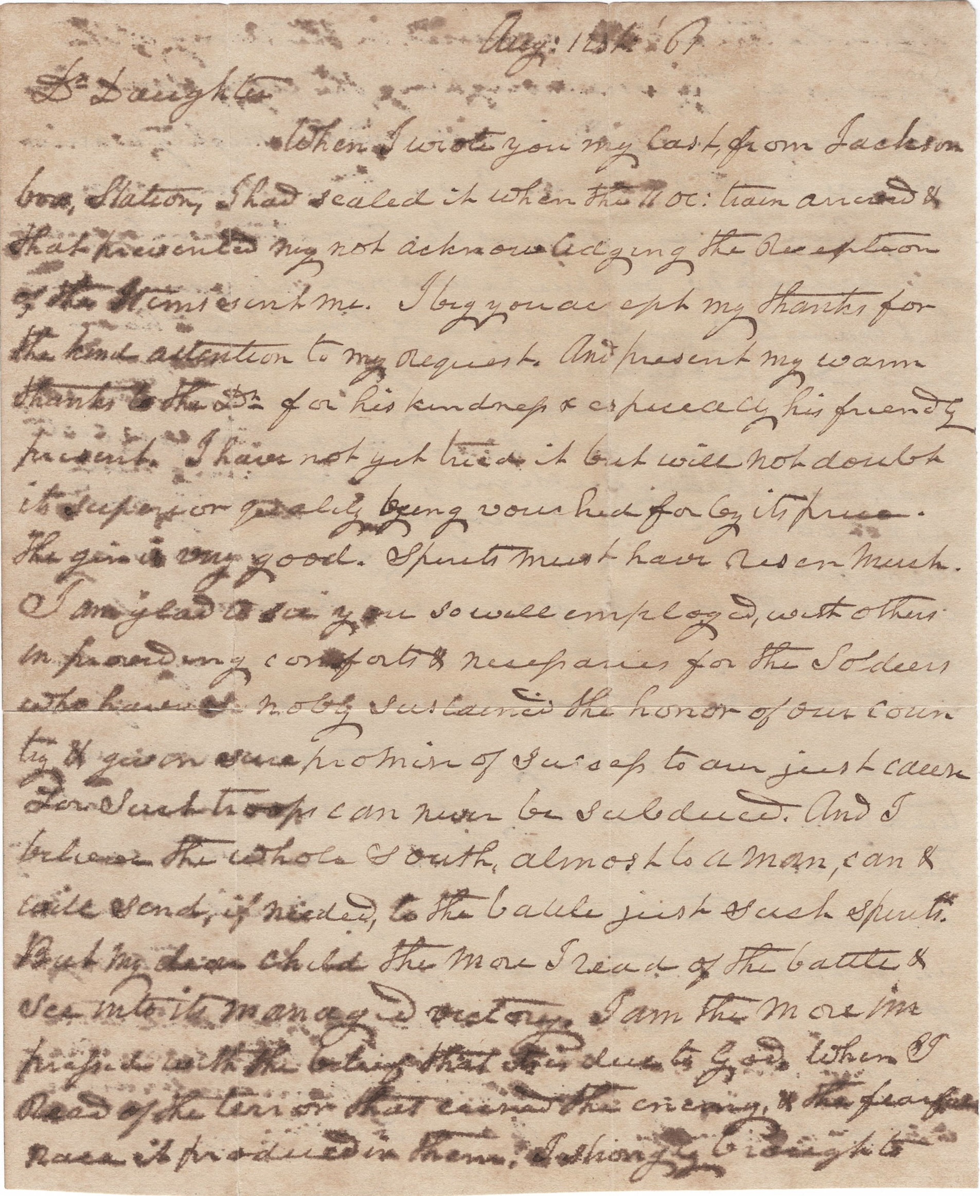 I only fear [Jefferson] Davis may commit the blunder of carrying the war into the enemy’s country. If he does, our army will be wasted and defeated. And we will [not have] a war on one year, [but] one of 4 or 5. Every man that is now growing tired of the war & unwilling to fight against us, will then be roused to fight for their homes & their country. Remain in the defensive and God will be with us. But let ambition or revenge rule us to carry the curse against women & children, & God will turn against our own soldiers [and we] will lose this war spirit, naturally so.