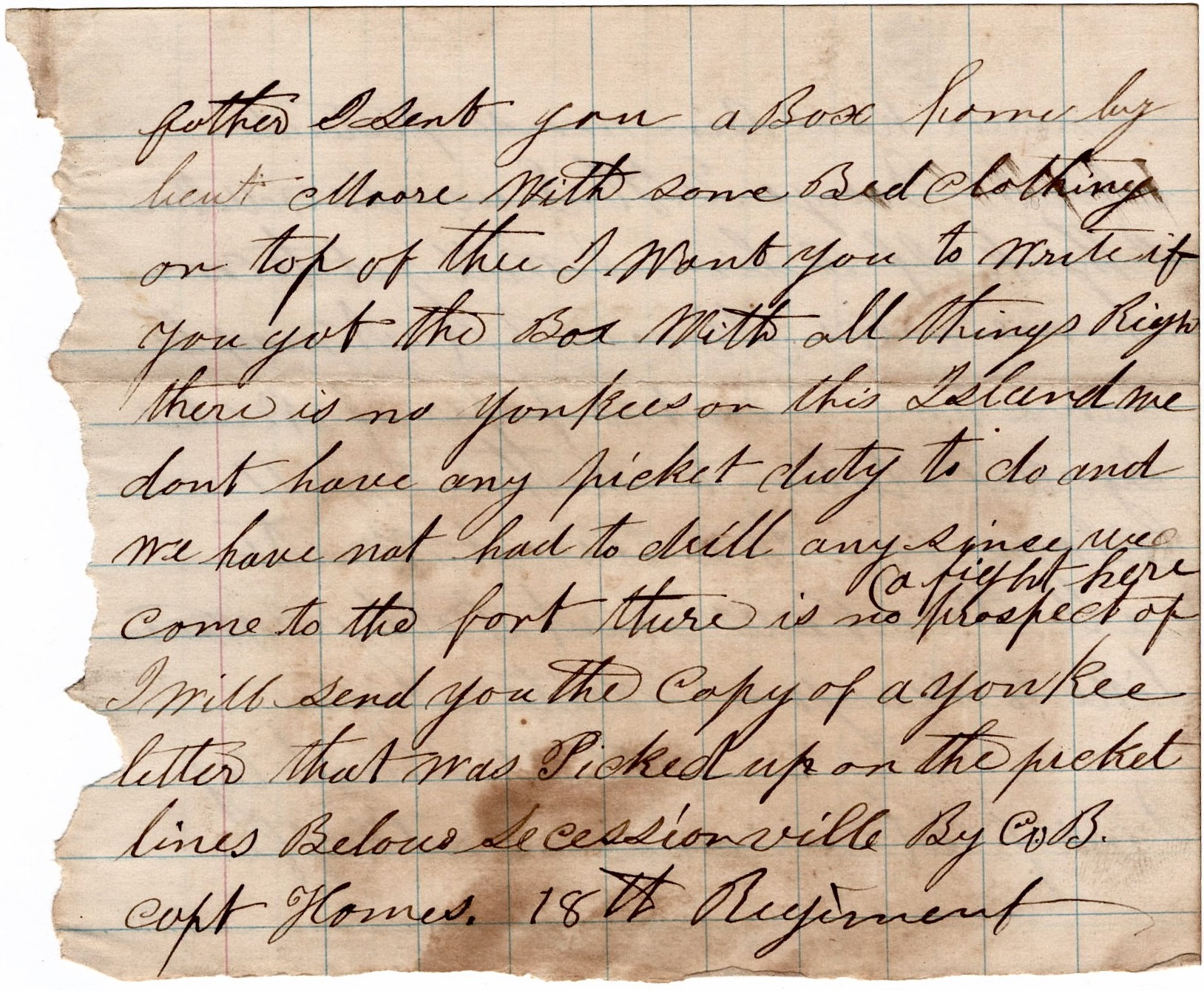 There is no Yankees on this island. We don’t have any picket duty to do and we have not had to drill any since we come to the fort. There is no prospect of a fight here. I will send you the copy of a Yankee letter that was picked up in the picket lines below Secessionville by Co. B, Capt. [John E.] Hames, 18th Regiment.