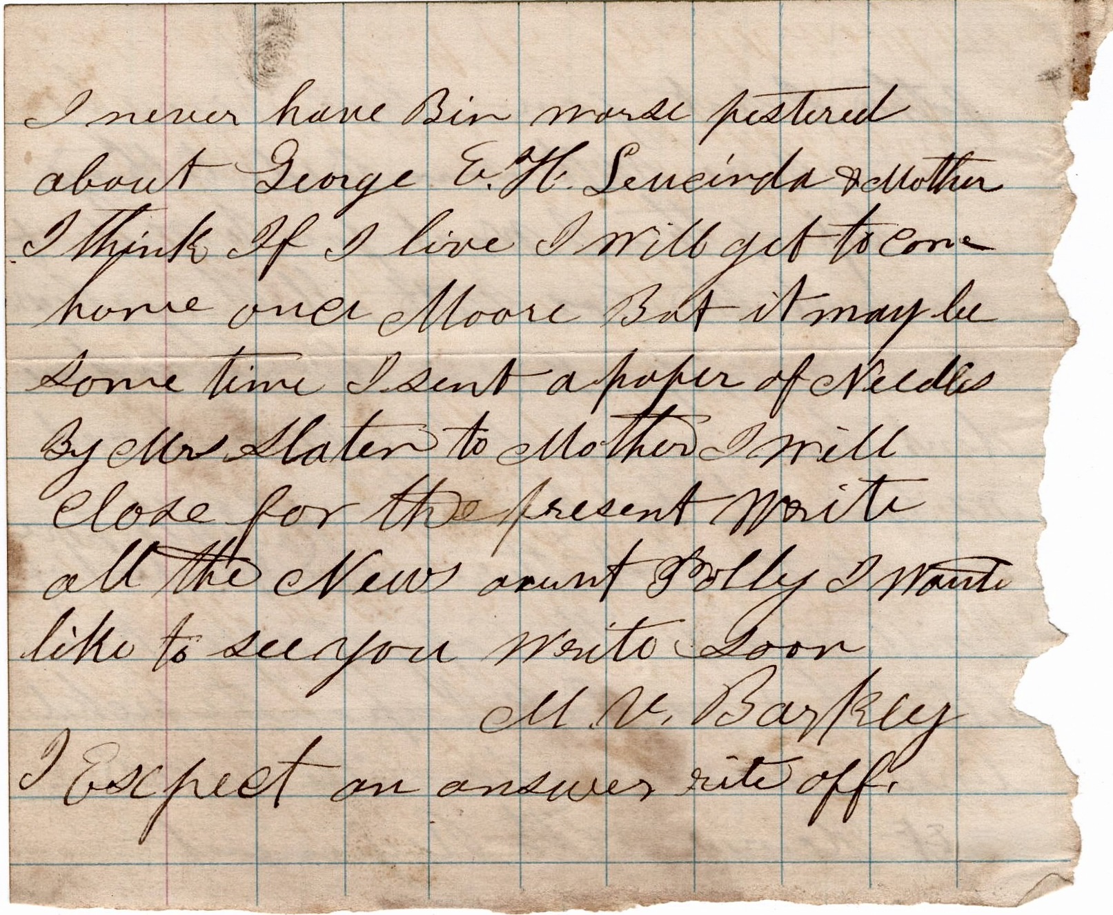 I will close for the present. Write all the news. Aunt Polly, I would like to see you. Write soon. — M. V. Barley