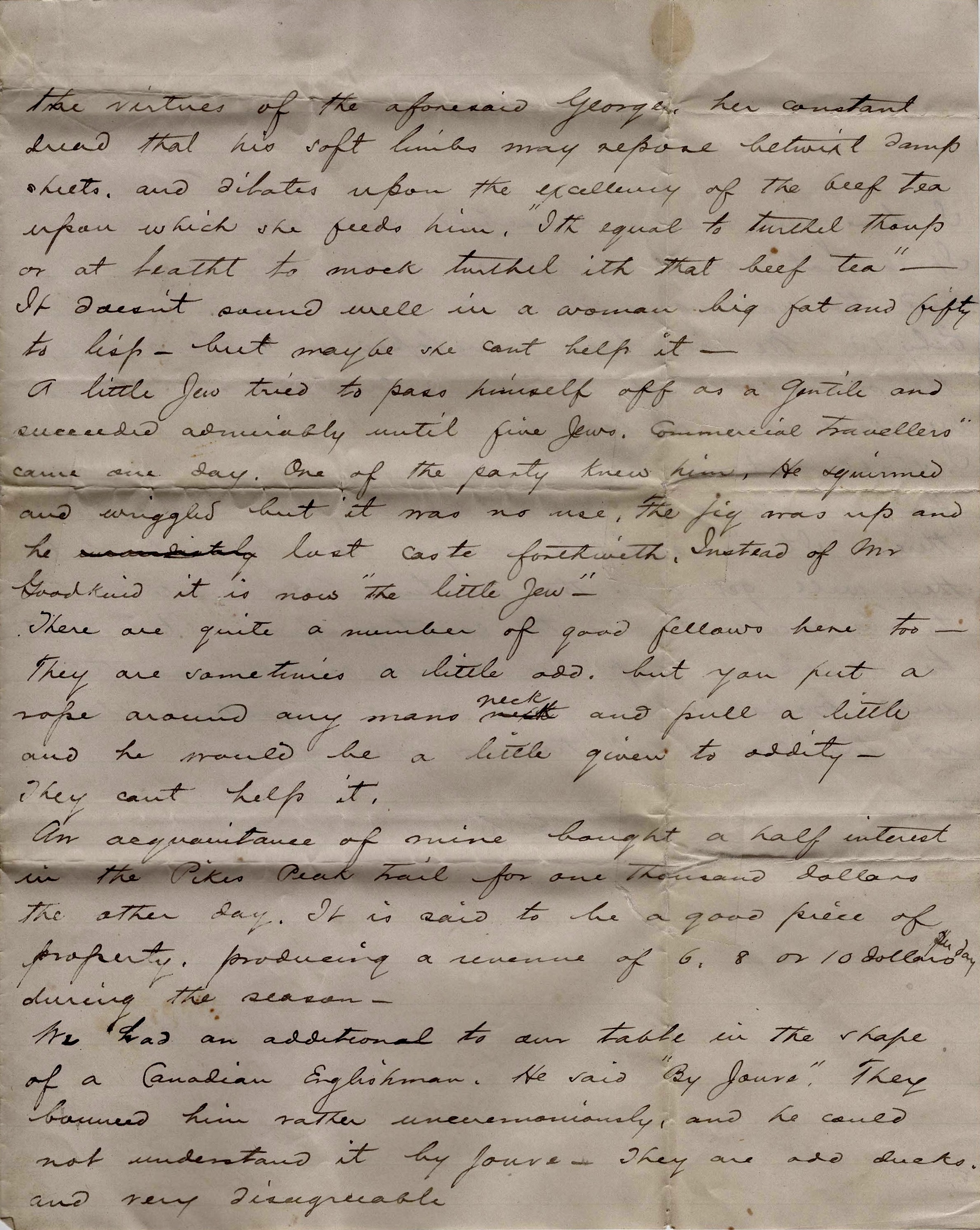 An acquaintance of mine bought a half interest in the Pikes Peak Trail for one thousand dollars the other day. It is said to be a good piece of property, producing a revenue of 6, 8 or 10 dollars a day during the season.