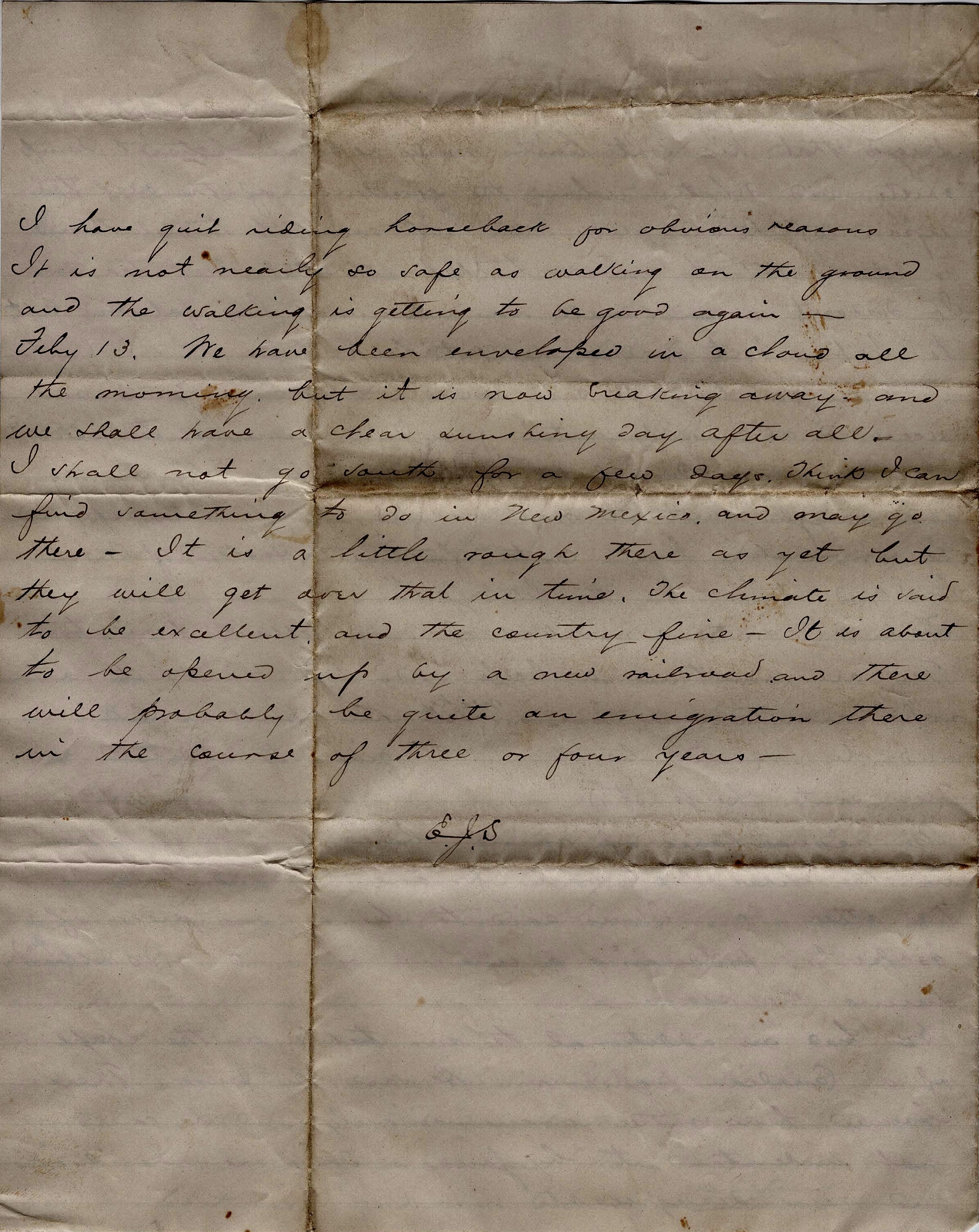 February 13. We have been enveloped in a cloud all the morning but it is now breaking away and we shall have a clear sunshiny day after all. I shall not go south for a few days. Think I can find something to do in New Mexico and may go there. It is a little rough there as yet but they will get over that in time. The climate is said to be excellent and the country fine. It is about to be opened up by a new railroad and there will probably be quite an emigration there in the course of three or four years. — E. J. S.