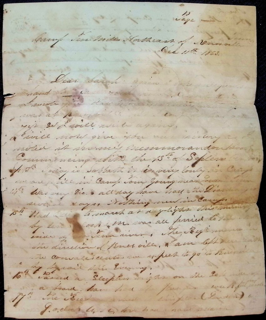 14th—Has rained pretty near all day. Some of our boys are very sick with the sore throat. John Ellis and Tom Winn have gone to the hospital.