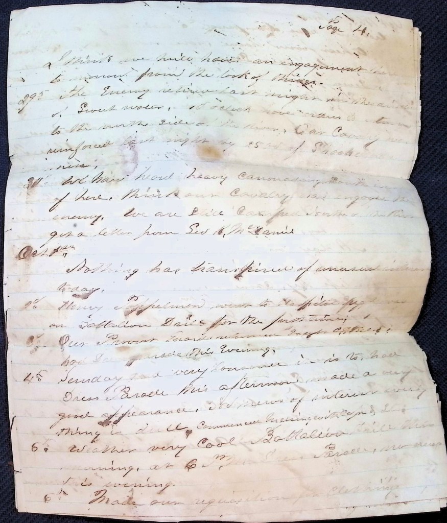 6th—Buried Joseph Kistner today in the Honors of War. We buried him near the stone fence some sixty or 80 yards south of the railroad shanty. I hope this may be the last one we have to bury while in the service.