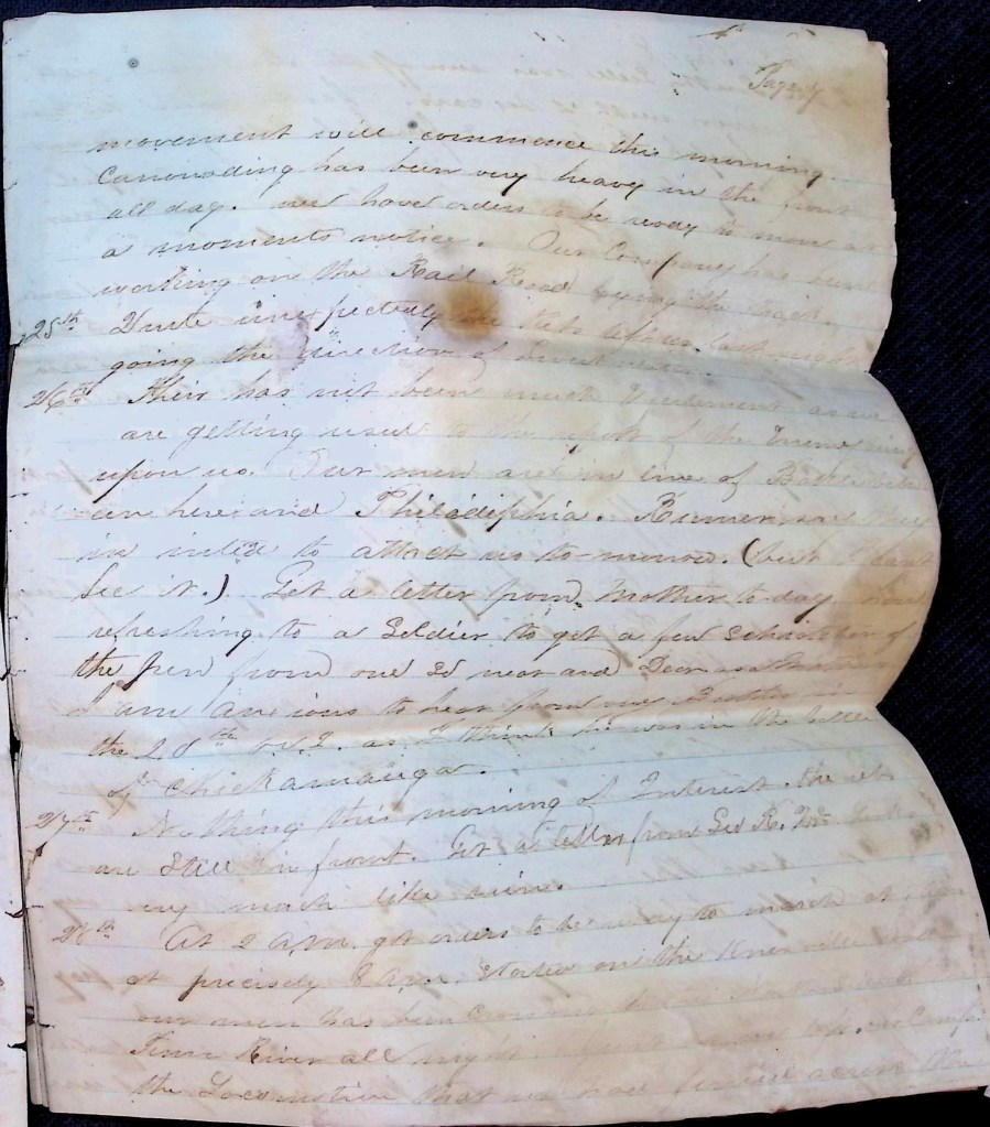 24th—Have not heard anything of the rebels. The trains is not running on the road.