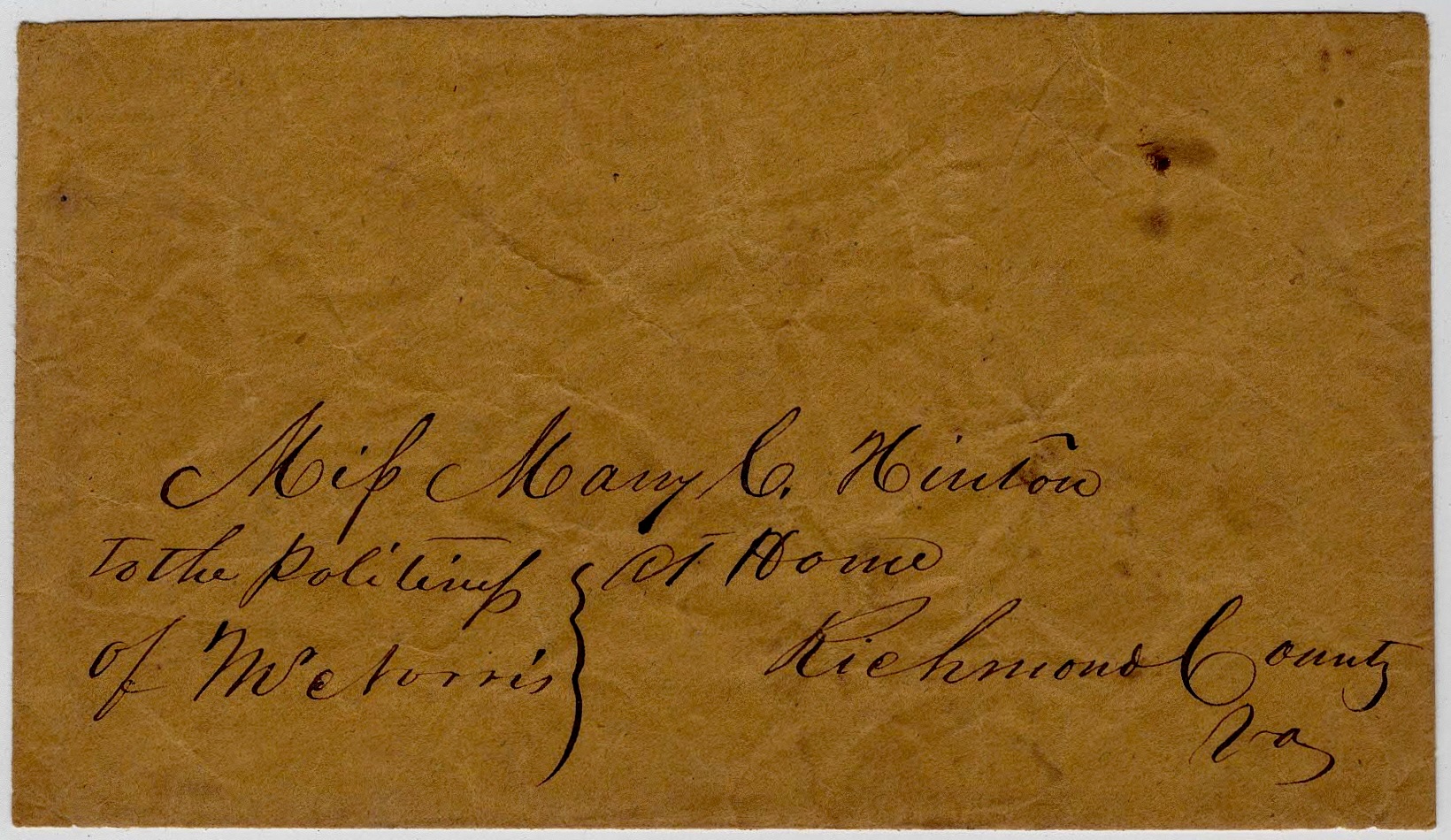 Addressed to Miss M. C. Hinton, Richmond county, Virginia