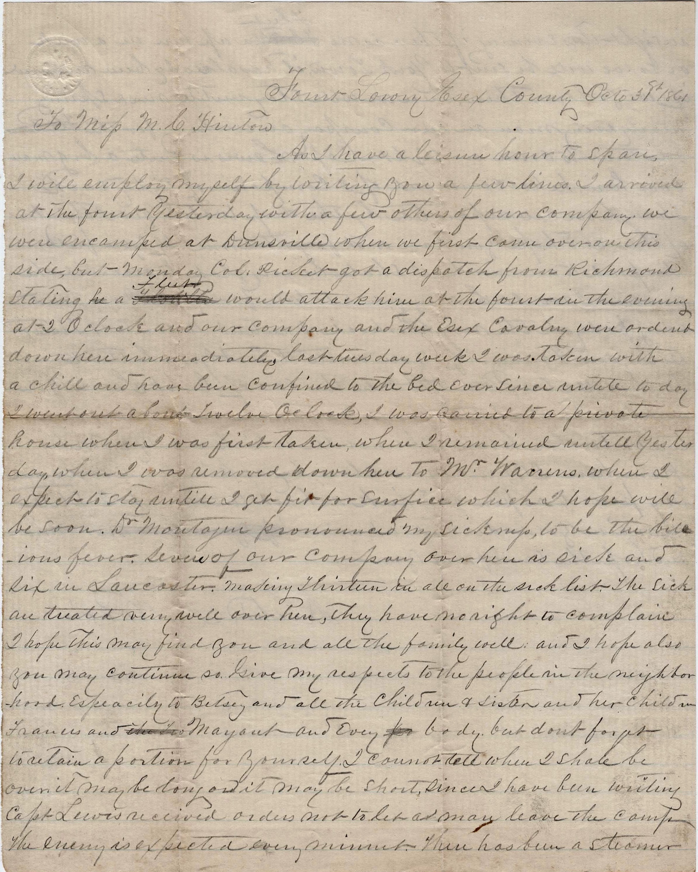 As I have a leisure hour to spare, I will employ myself by writing you a few lines. I arrived at the fort yesterday with a few others of our company. We were encamped at Dunnsville when we first came over on this side, but Monday Col. [George E.] Pickett got a dispatch from Richmond stating a fleet would attack him at the fort in the evening at 2 o’clock and our company and the Essex Cavalry 1 were ordered down here immediately last Tuesday week.