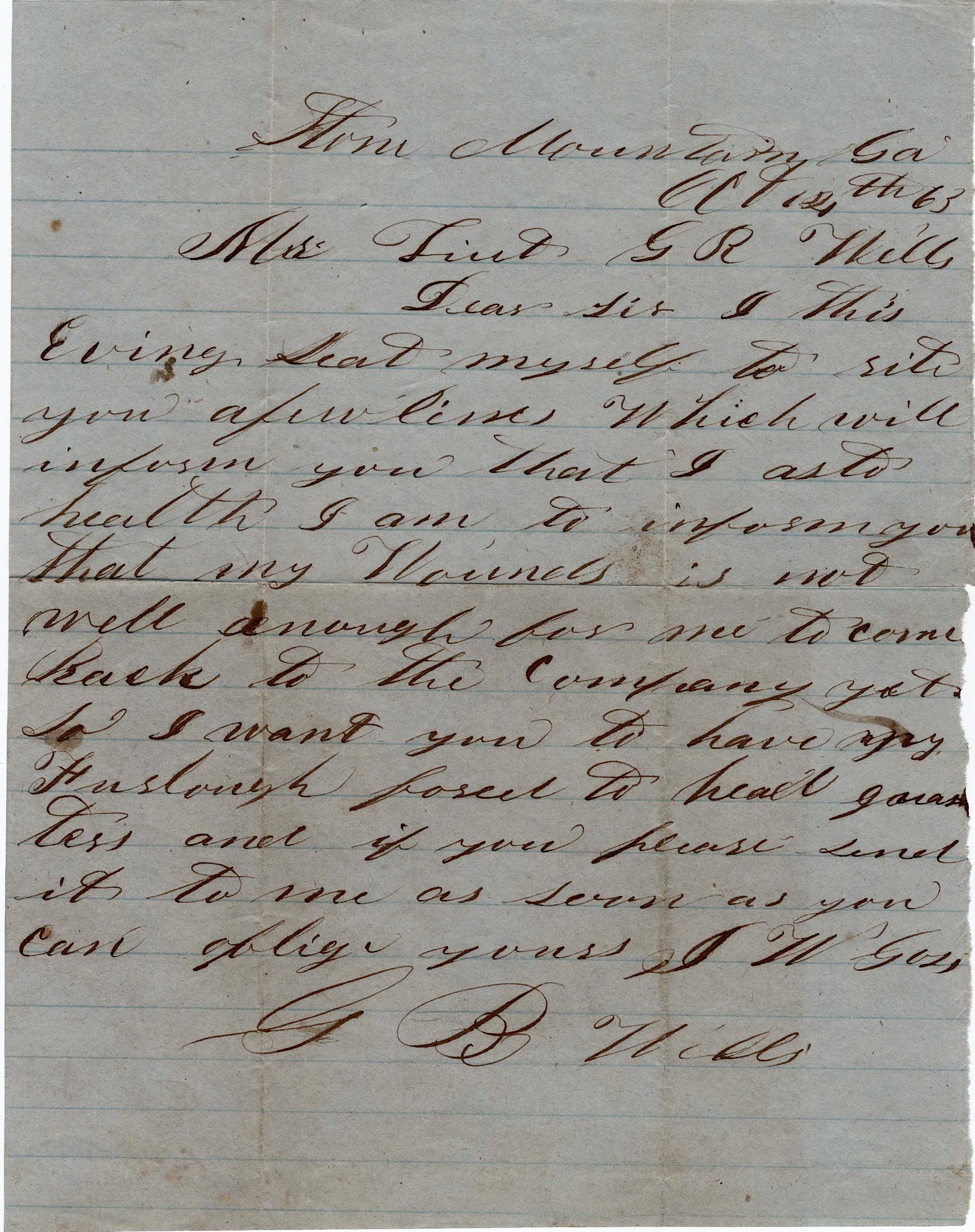 Dear sir, I this evening seat myself to write you a few lines which will inform you that I as to health, I am to inform you that my wounds is not well enough for me to come back to the company yet. So I want you to have my furlough forwarded to headquarters and if you please, send it to e as soon as you can oblige. Yours, — J. W. Goss