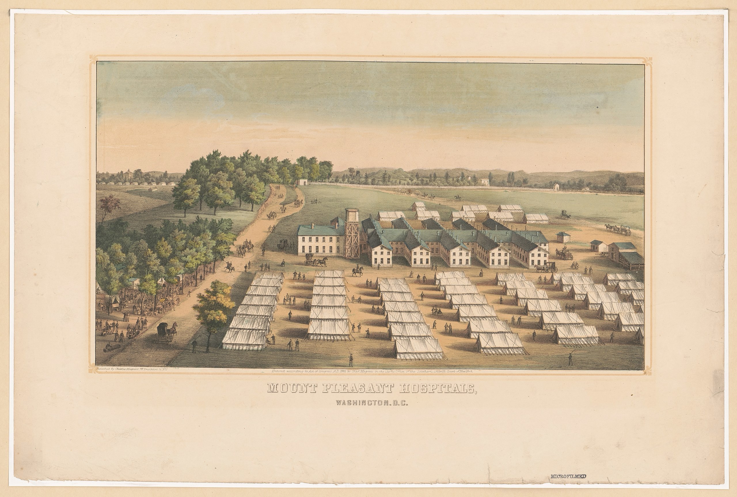 Simon informs us that he was working in the Mount Pleasant General Hospital (pictured below) which was a purpose-built hospital raised in the winter of 1861-62 on Meridian Hill in the District of Columbia. During construction the buildings were guarded day and night by 9 soldiers under the orders of General Sykes to prevent attempts of incendiarism. It was based on plans provided by P.B. Wight, Esq. of New York and built under the approval of the Sanitary Commission.